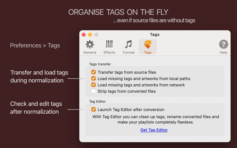 MP3 Normalizer can transfer all tags from source .mp3 or .wav file to normalized file, create missing metadata from files and folders names, or load music tags from online databases - such as MusicBrainz, AcoustID, CoverArt. If you would like to check or modify tags after normalization, please, use our Tag Editor.