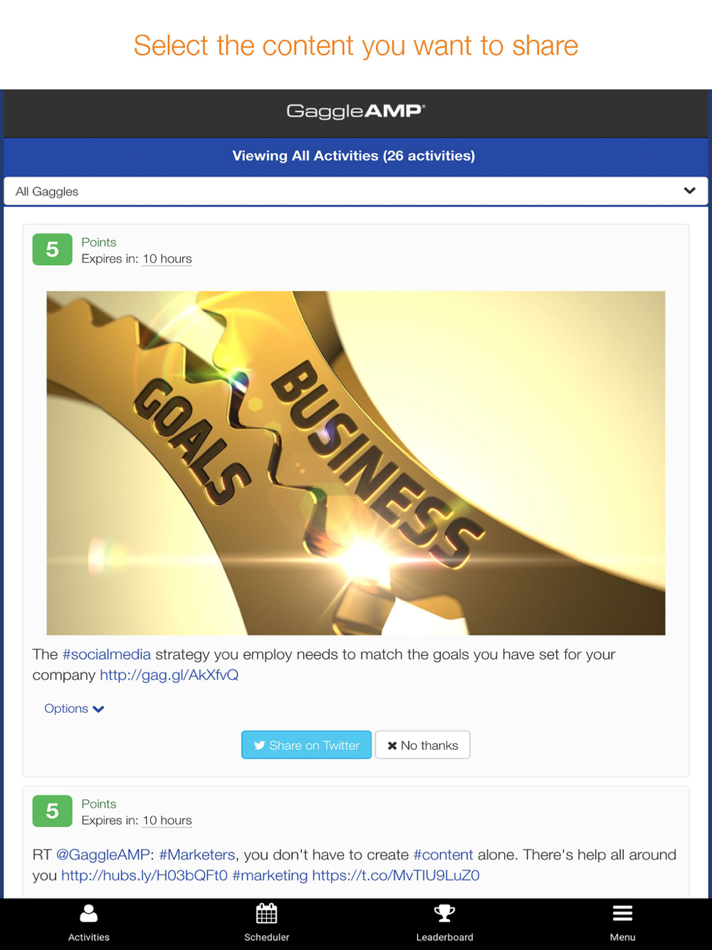 GaggleAMP is a social media amplification platform used by leading companies and organizations to empower their stakeholders (employees, partners, resellers & customers) to share curated company content.