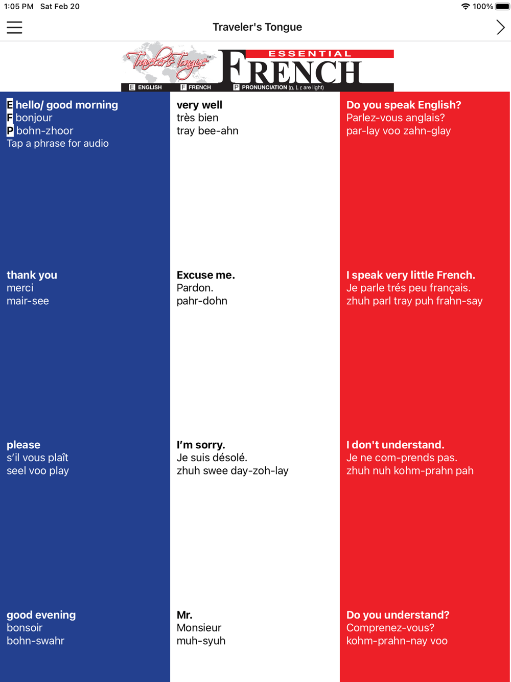 When we travel to a foreign country we are demonstrating an interest in that culture. Speaking a little of the native language is part of the cultural experience. There are many Applications and phrase books on the market that offer far more words and phrases, and they are excellent reference sources. However, Traveler’s Tongue provides the most essential and practical words and phrases. They are meant to be learned because you will have an opportunity to use them often. Each entry provides a written phonetic spelling of the word as well as an auditory function.