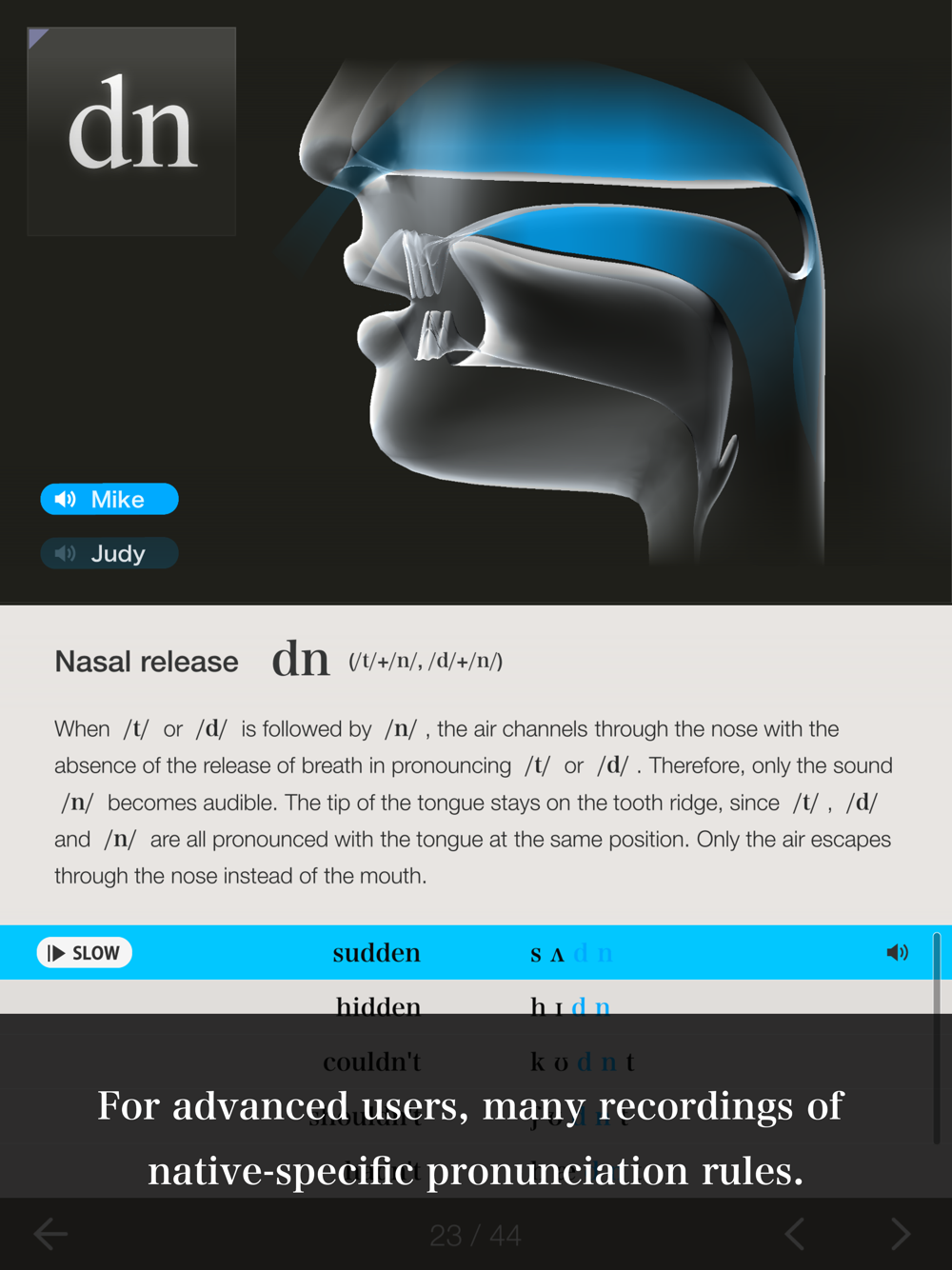 1. You can play 41 different phonemes observed in American English by touching the 3D simulation model of the oral structure on the screen.