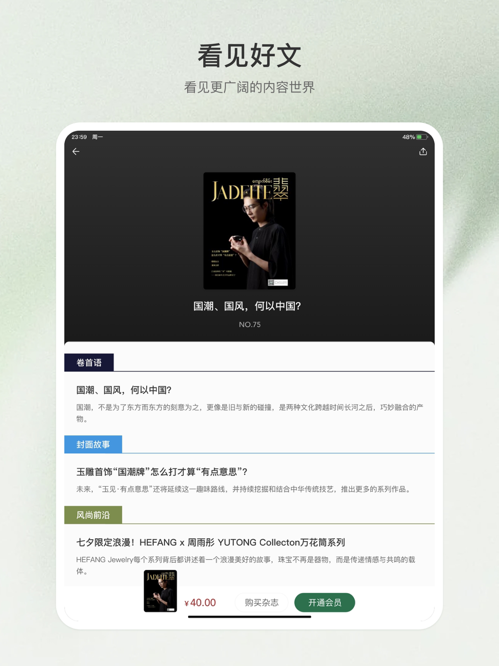 《中国翡翠》官方电子杂志,以翡翠为主,涵盖所有珠宝品类。为读者提供前沿资讯,通过珠宝鉴赏提供指导性珠宝知识,透过珠宝历史,展示珠宝文化独特视角,提升珠宝的人文价值;彰显珠宝消费新趋势,促进珠宝文化地域融合;通过个体描述,提示珠宝共性之美。