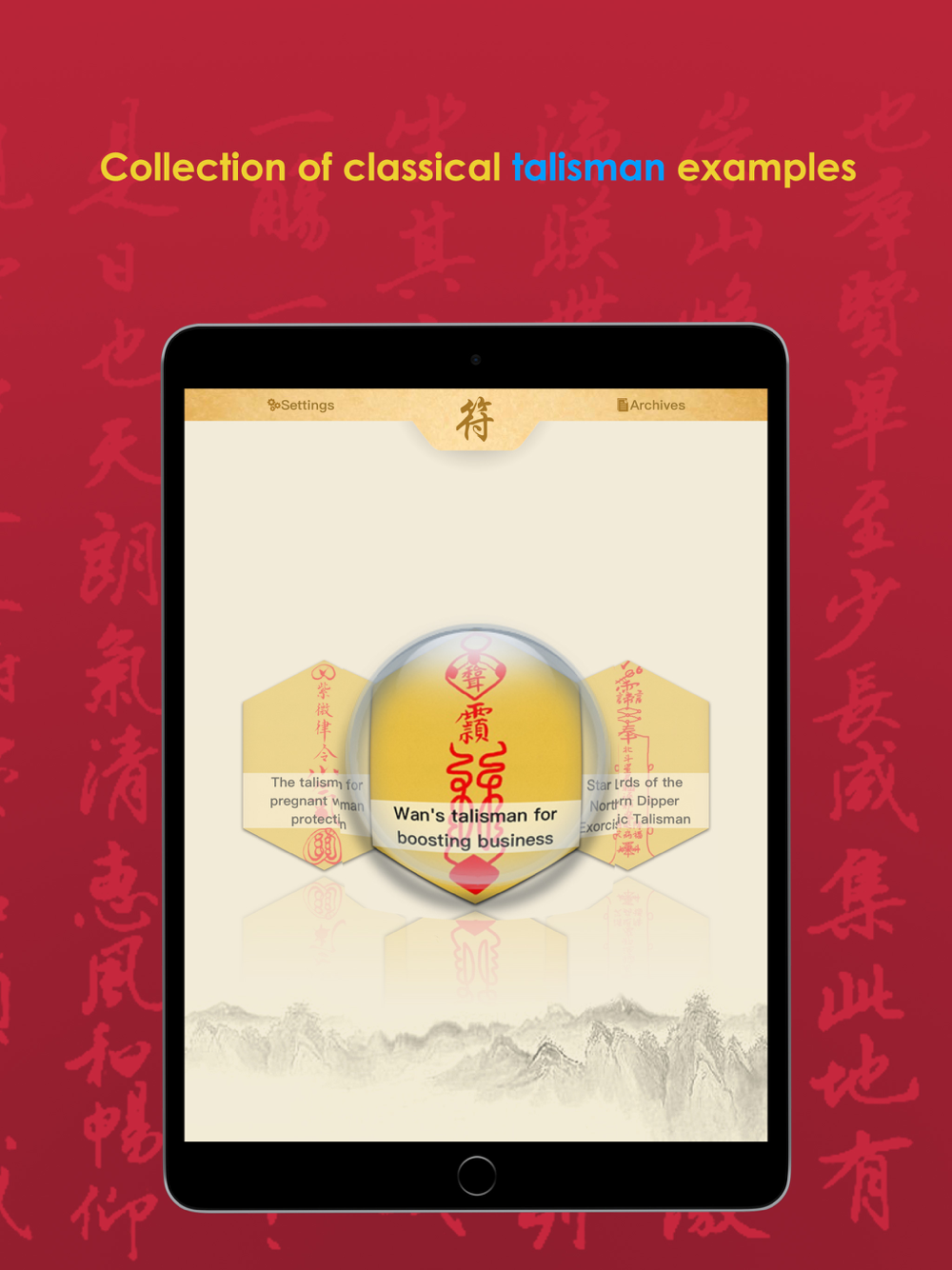 Taoist Talisman is an app that reveals the mystery of Chinese Taoist Talisman. It animates the whole course of drawing a Taoist Talisman, with great details of meaning and spell involved in every single stroke. Besides watching, you can learn to draw talismans on the screen, with your fingers as an ink brush! You'll be definitely impressed by not only the charm of Taoist Talismans but also the elegance of Chinese calligraphy.