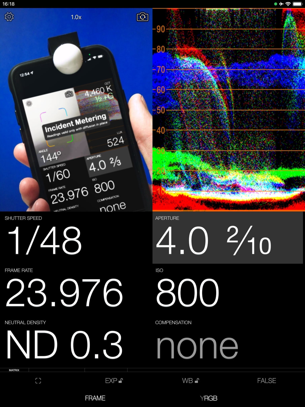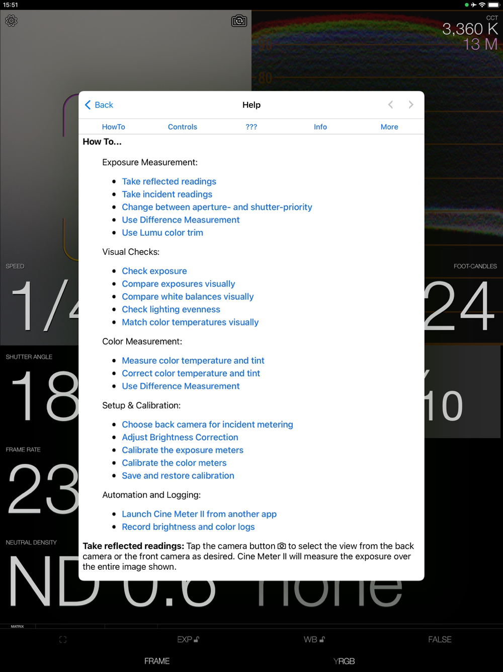 Shutter speeds, apertures, and ISOs shown in Cine Meter II are for metering purposes only and do not control the shutter speed, aperture, and ISO of the iPhone camera. The iPhone camera uses whatever exposure settings it needs to capture a reading. Cine Meter II is a light and color meter only; it is *not* a camera simulator.