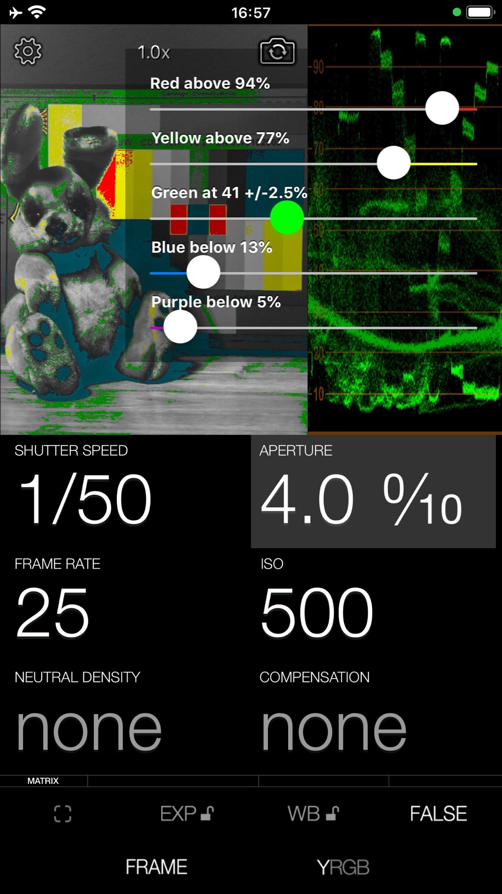 • False-color mode lets you define allowable contrast ranges, and see instantly which shadows are underexposed and what highlights risk clipping.