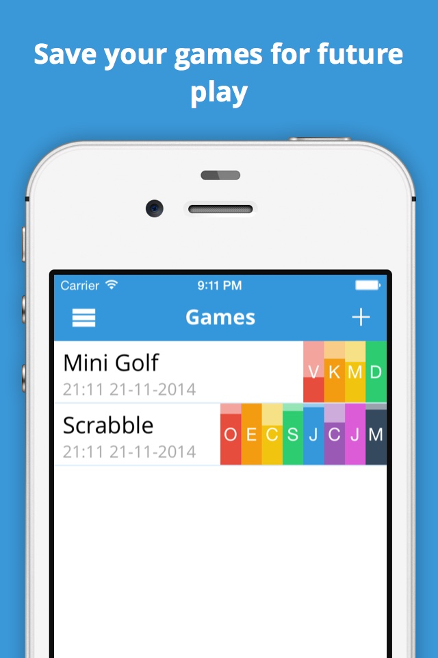 Don't have pen or paper to write the score of your game? Use iSaveScore! iSaveScore is a simple and convenient tool that allows you to easily keep score on your device of the games (boardgames, card games or group activities) that you play with your friends and family. It also automatically recalculates the score as you go along, allows you to edit scores and keeps a record of the games you have played. You can personalise it by naming your games and participants when you start a new game. Press the download button now!