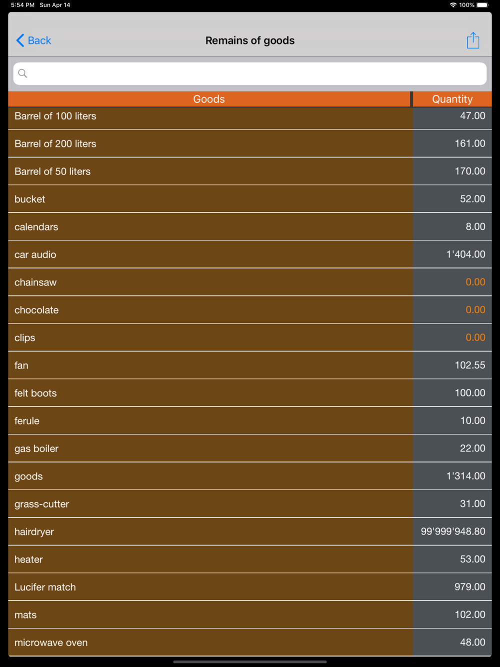 In the «GOODS» section you may: maintain a list of goods, to carry out "the arrival / consumption» of goods, execute «returns from client», to get information about the "movement" of each goods, receive a list of the "arrival" of the goods for the required period as well as the remains of view products in stock. There is a possibility of working with products of bar code that will read by the iPhone / iPad camera.
