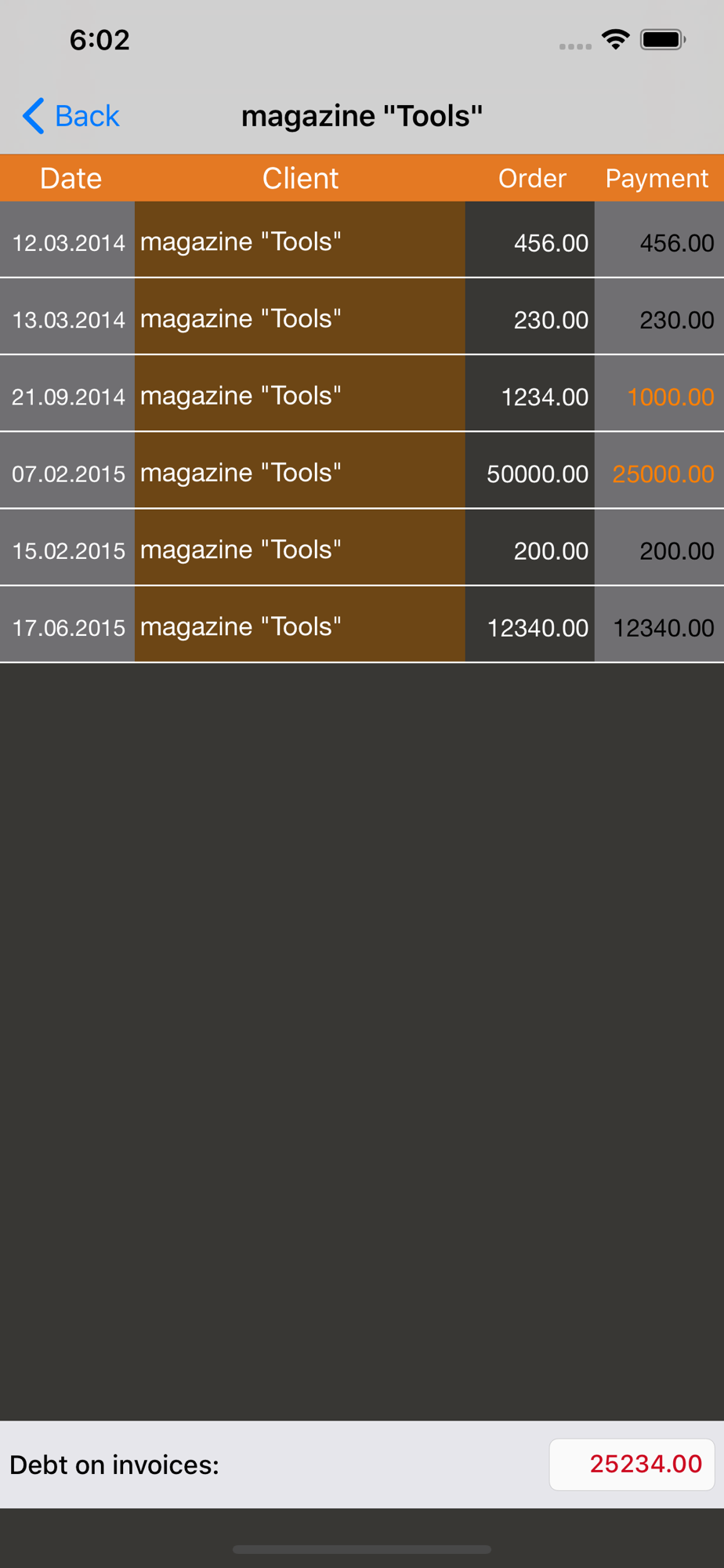 In the «SETTINGS» section, you can configure: the date format, the password to run the program, notification of debtors, as well as to import / export database application through the service Dropbox. With this function you can exchange data with other applications on devices that have installed "warehouse".