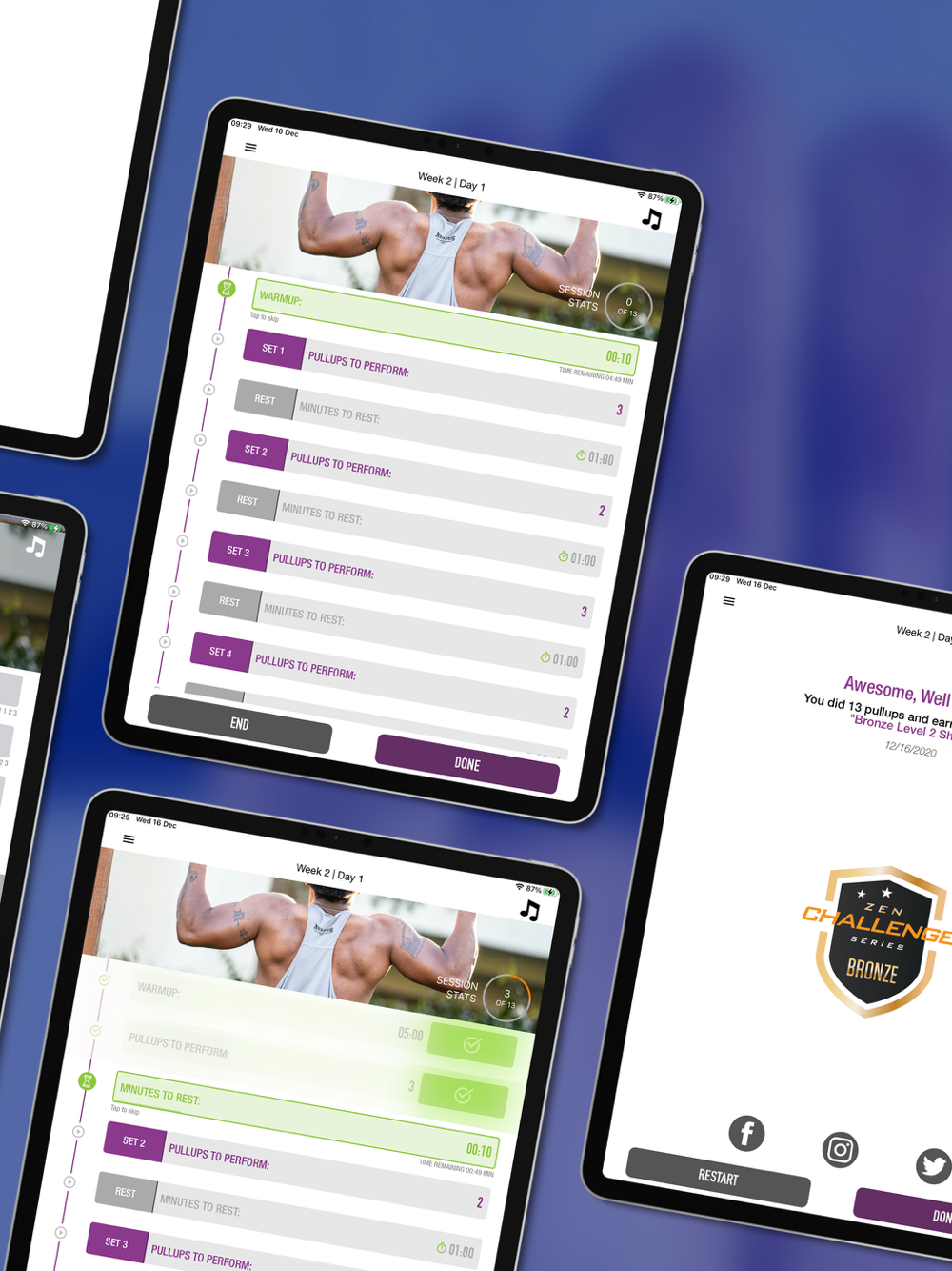 Using a proven program, you will be able to complete 20 straight pull-ups after just 6 weeks! The Zen Challenge Series is tailored towards all fitness levels. From first-timers to fitness veterans, this app will build up your strength and stamina to complete 20 pull-ups. Can't do a single pull-up? Don't worry, there is a built-in program to help you build strength to get there!