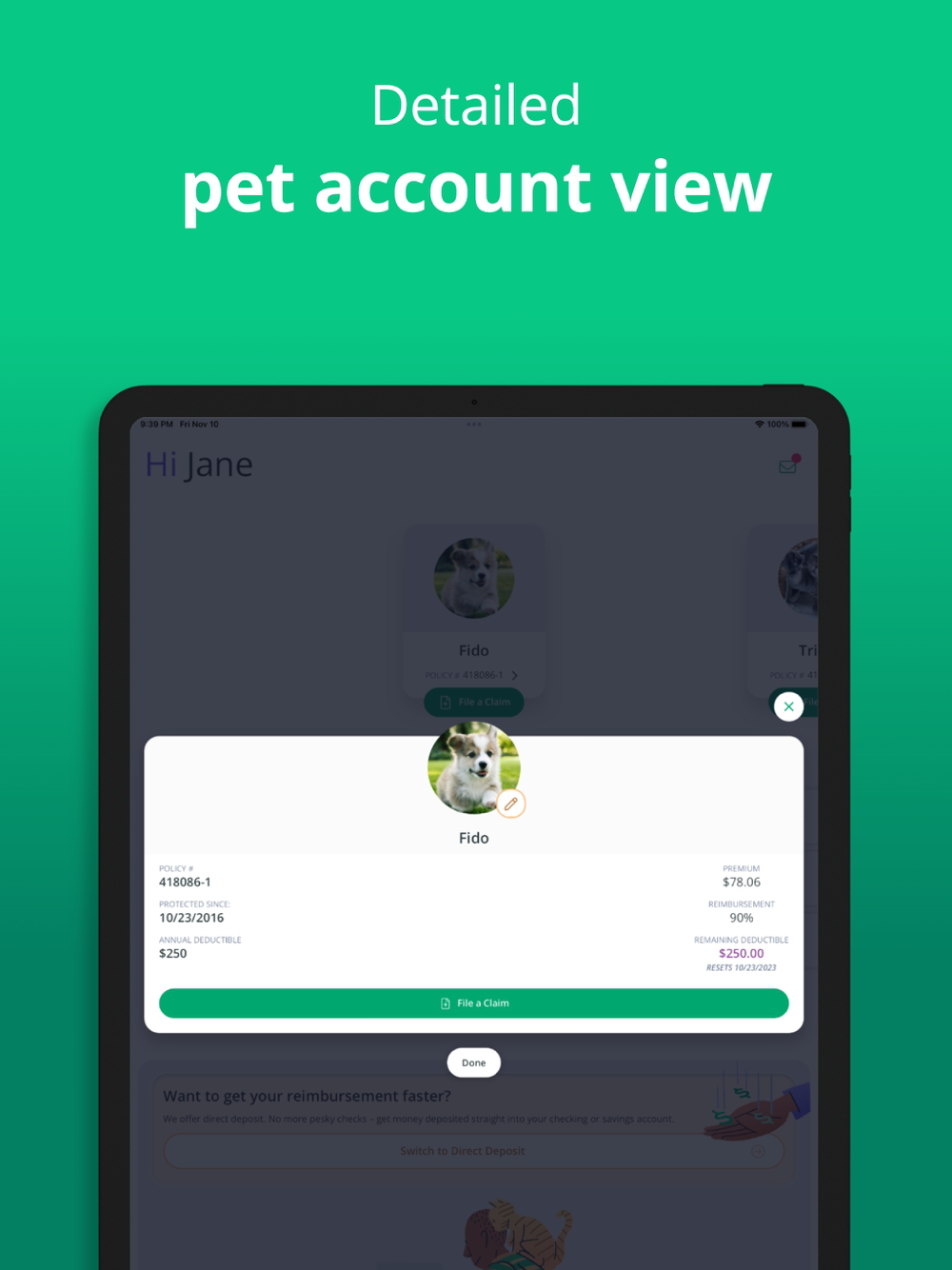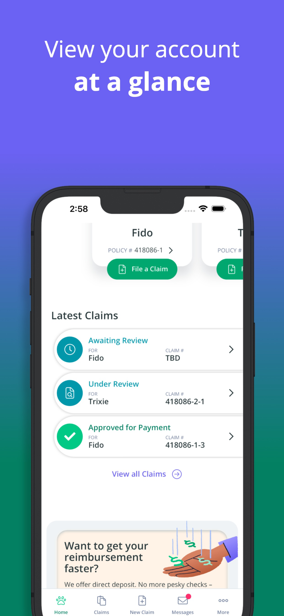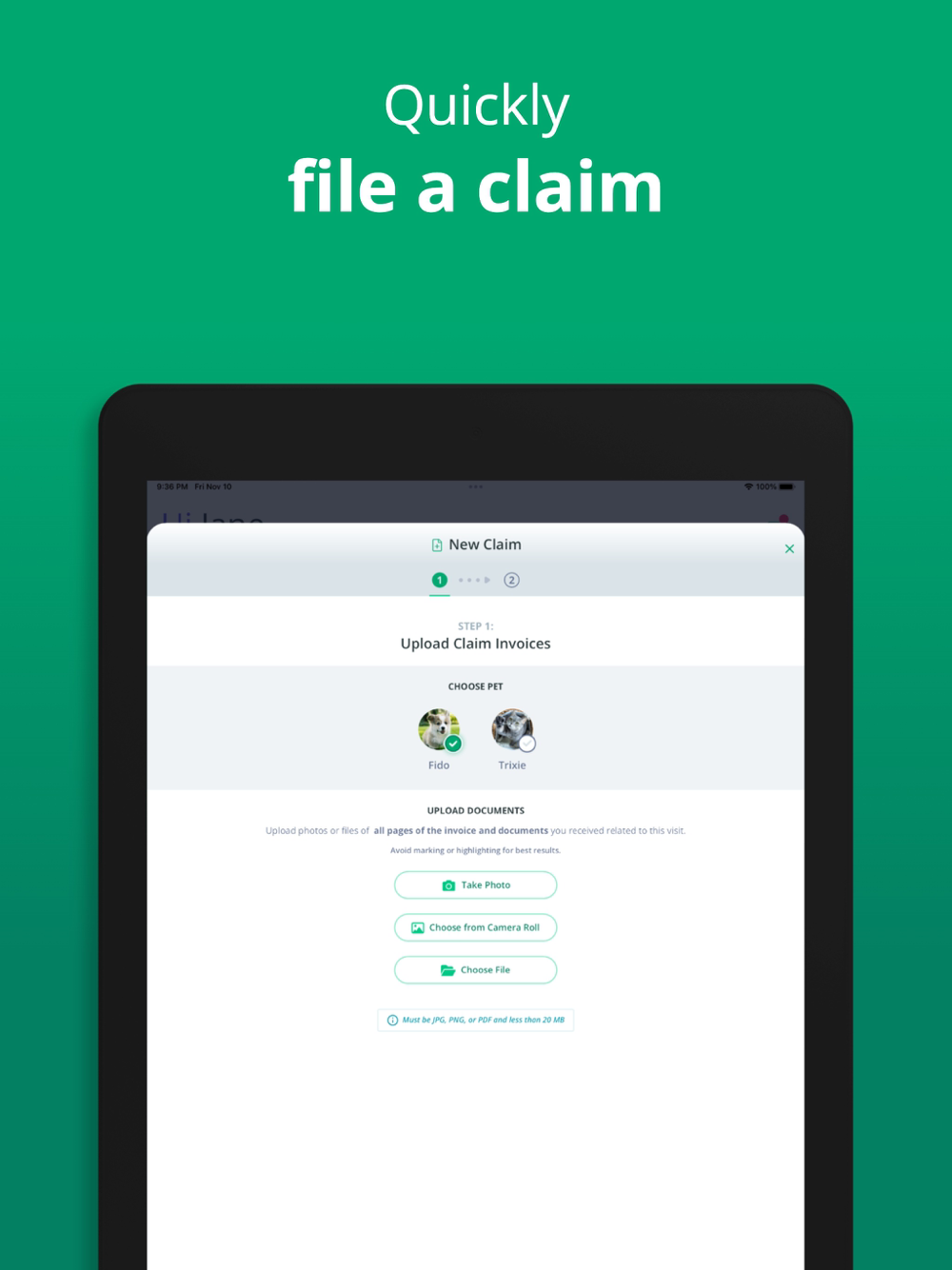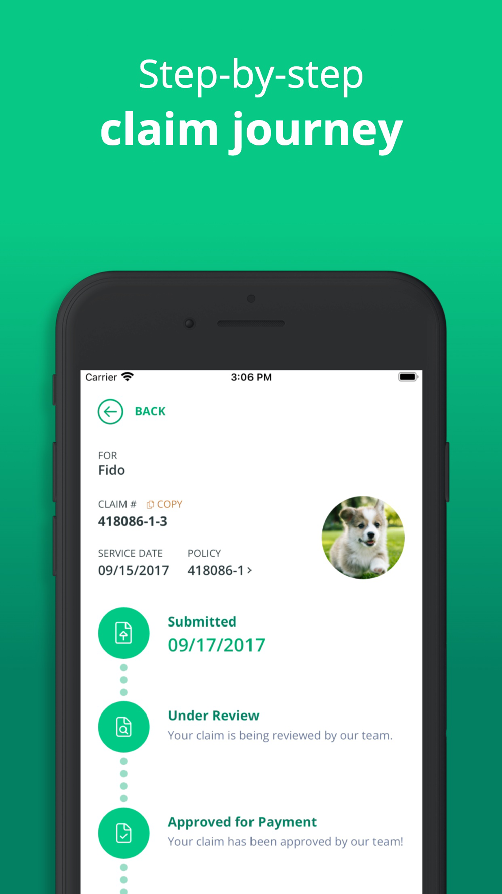 • Updated, easier-to-use design • New user-friendly, one-touch navigation• Simply take a photo or upload a file of your invoices/records• Straightforward and speedy claim filing process• Easy direct deposit setup for claim reimbursements• Most recent account/claim information on homepage• Easy-to-understand claim status updates• Improved ability to manage your account• Ability to submit veterinary medical records with a claim