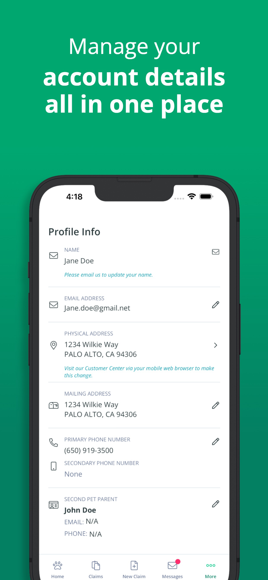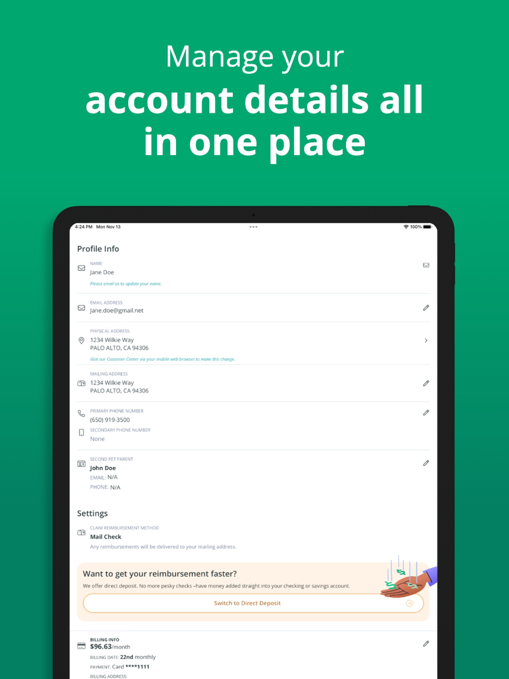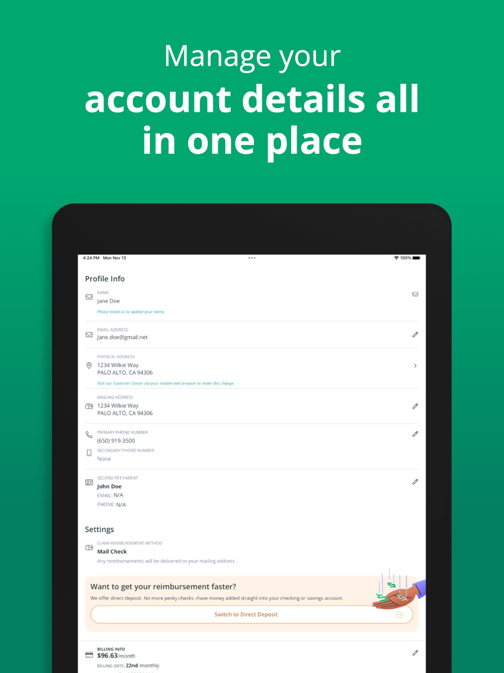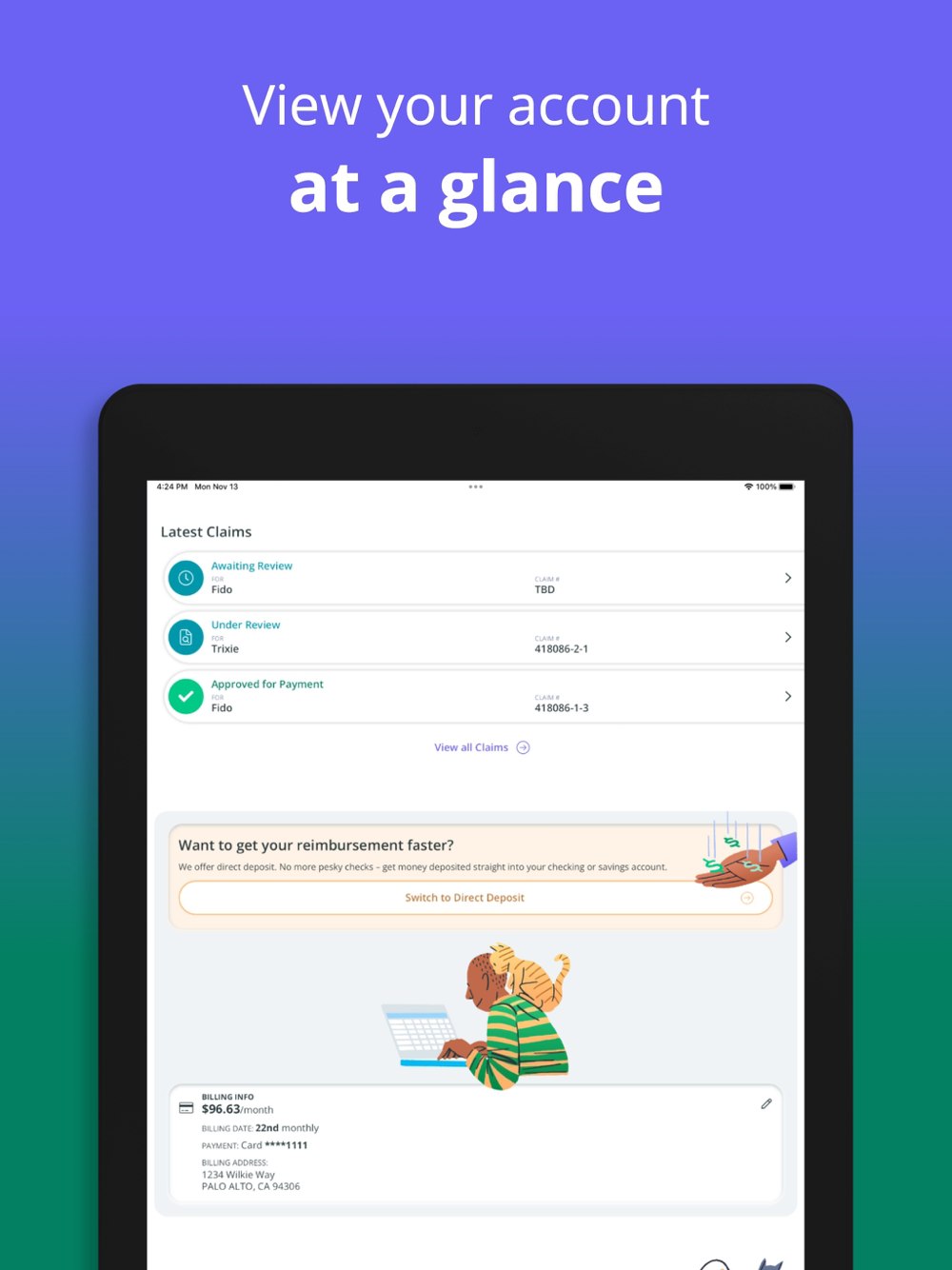 • Updated, easier-to-use design • New user-friendly, one-touch navigation• Simply take a photo or upload a file of your invoices/records• Straightforward and speedy claim filing process• Easy direct deposit setup for claim reimbursements• Most recent account/claim information on homepage• Easy-to-understand claim status updates• Improved ability to manage your account• Ability to submit veterinary medical records with a claim