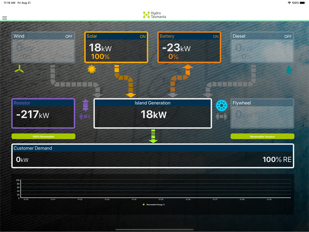 Monitor your home energy usage remotely. This app is primarily targeted to selected participants of the King Island Smart Grid. Participants are able to login using previously provided log-in details to view their energy use data over various timescales. Other users can take advantage of this app by viewing in real-time the renewable energy contribution to the world leading King Island Advanced Hybrid Power System. This world leading off-grid system was developed through the King Island Renewable Energy Integration Project (KIREIP).