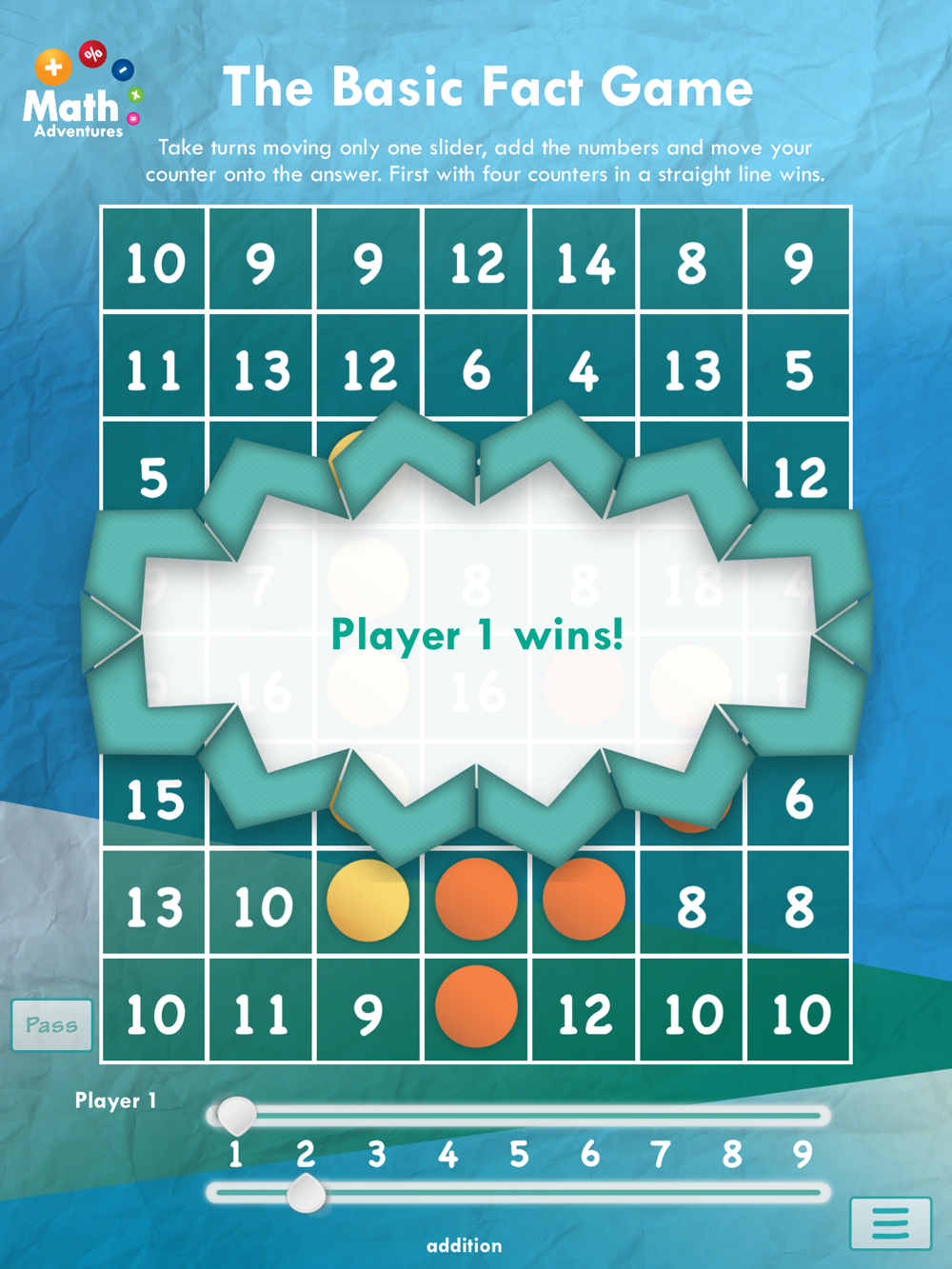 The Basic Facts Game is an iPad board game for two players. The game helps children learn addition, subtraction, multiplication and division number facts, as well as develops strategic thinking.