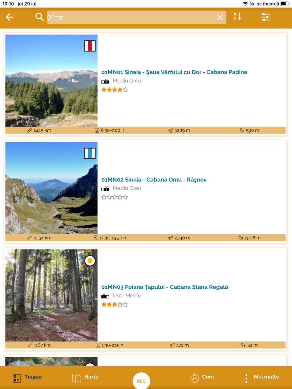 • odată activat GPS-ul, lista traseelor se afișează în funcție de elementele filtrate, cuprinzând traseele cele mai apropiate de poziția utilizatorului