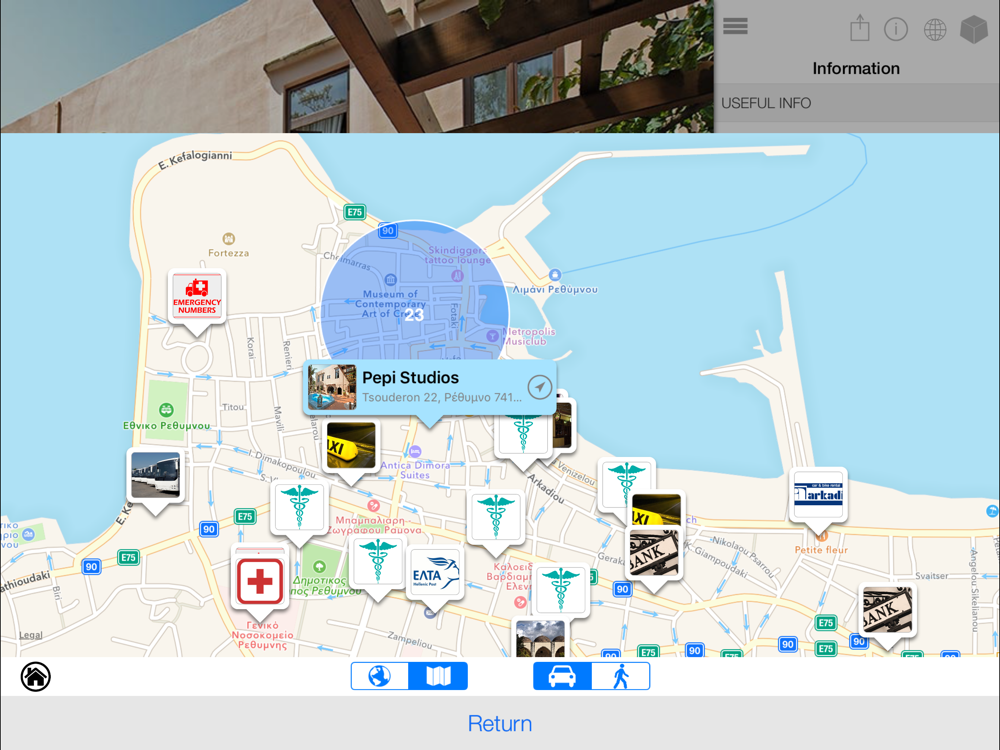 * Rent a car information / Health services / Transportation (Bus & Taxi) / Banks / Post Offices / Shopping