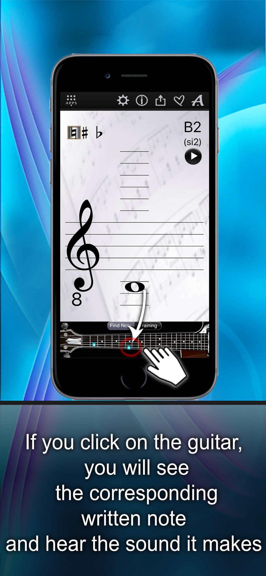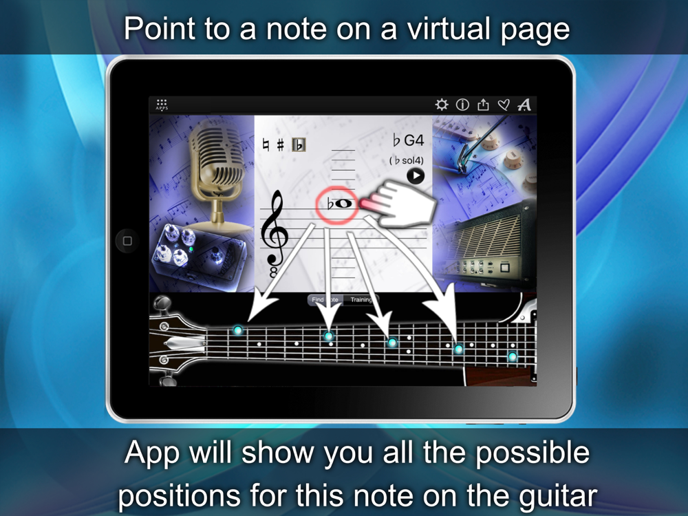 When you point to a note on a virtual page, GuitarNotesFinder will show you where this note is on a guitar and the other way around, if you click the guitar, you will see the corresponding note and hear the sound it makes.