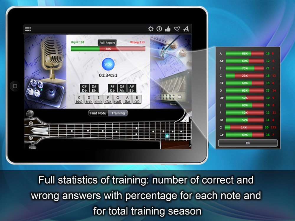 The “Note Trainer” asks for the notes showing you the frets and offers the full statistics to show where you are making mistakes, so you can measure progress in sight reading and see when you’ve exceeded your personal best.