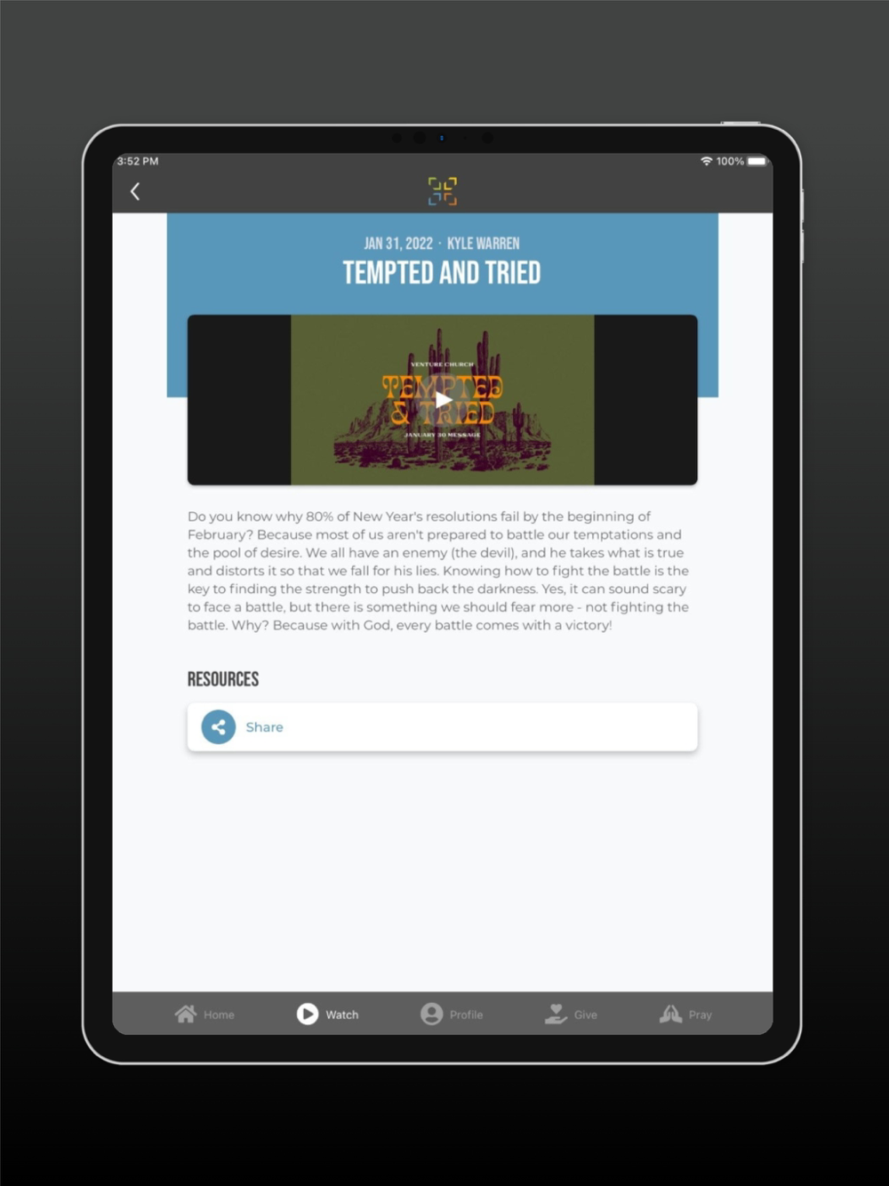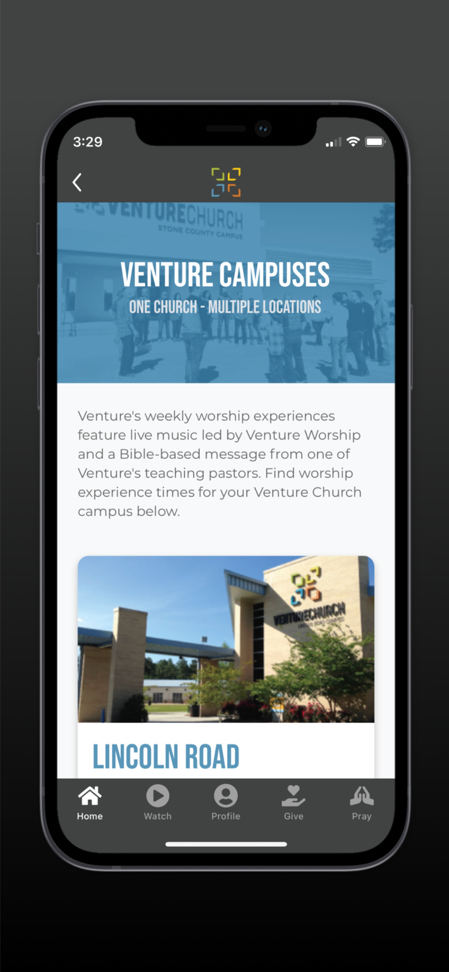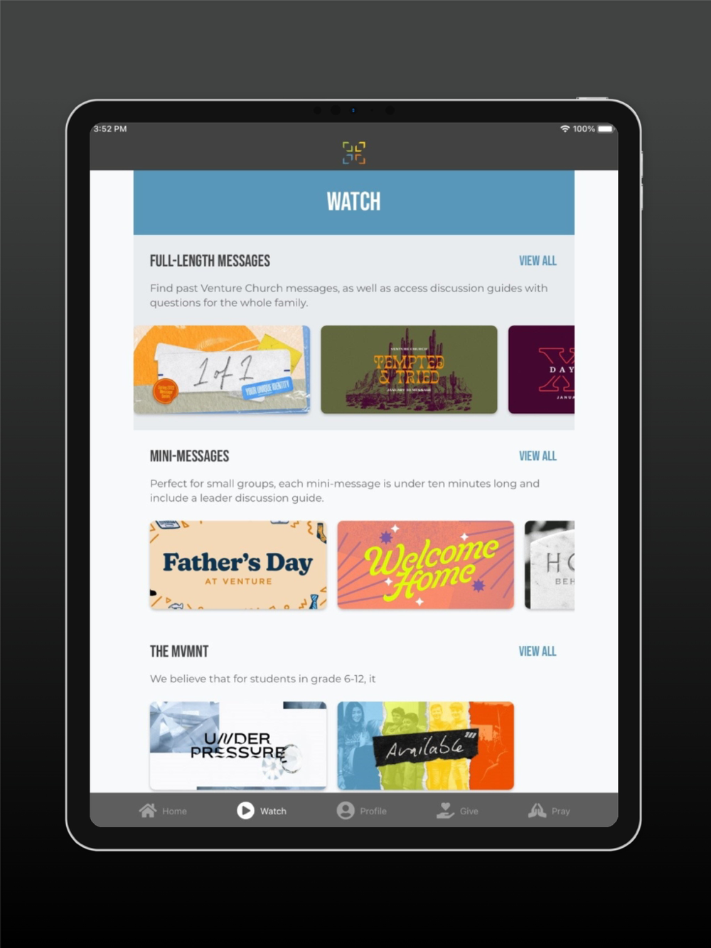 This free app allows you to connect with Venture Church by watching our Live Stream, finding location information, watching or listening to past experiences, giving online and much more! You can even share with friends and family via social media and email.
