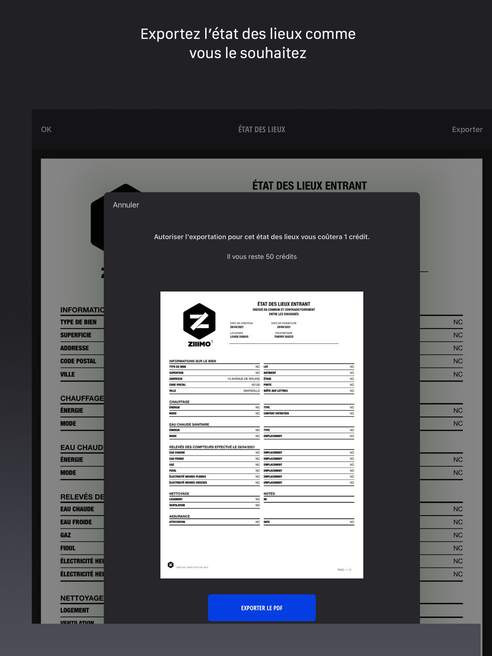 La création d'un état des lieux reste gratuite. Néanmoins, pour exporter un état des lieux, c'est à dire l'envoyer aux différents signataires, il est nécessaire d’acheter un crédit. Directement disponible en achat intégré dans l’application.