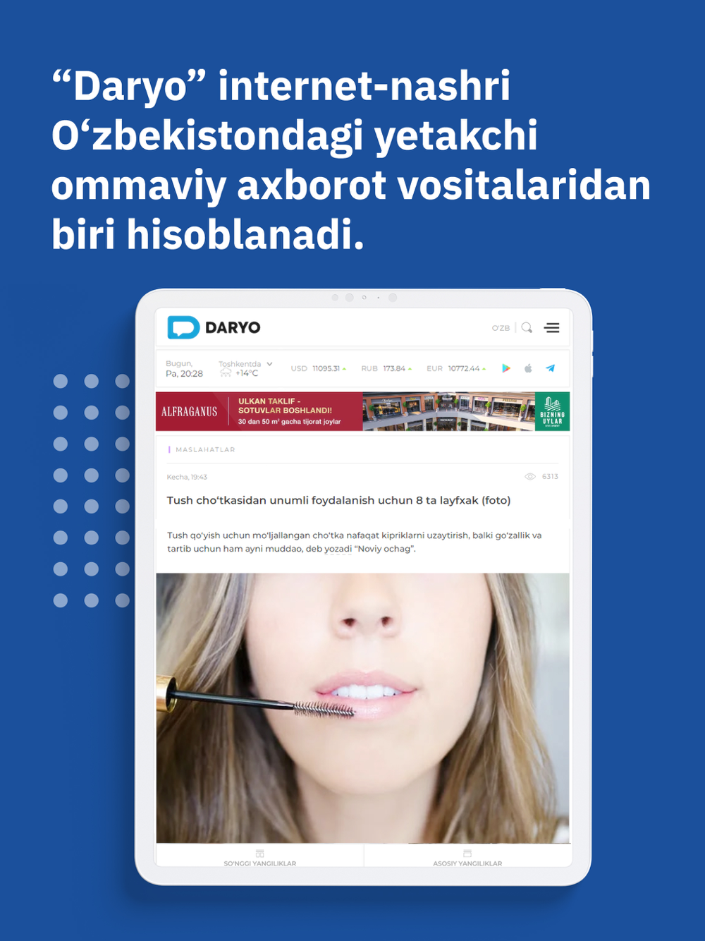 “Daryo” — jahonda va O‘zbekistonda sodir bo‘layotgan eng so‘nggi yangiliklarni o‘zbek o‘quvchilariga sodda va tushunarli tilda hamda tezkor yetkazib berishga mo‘ljallangan internet-nashrdir.
