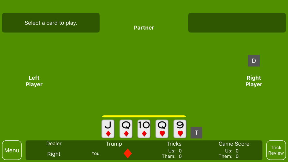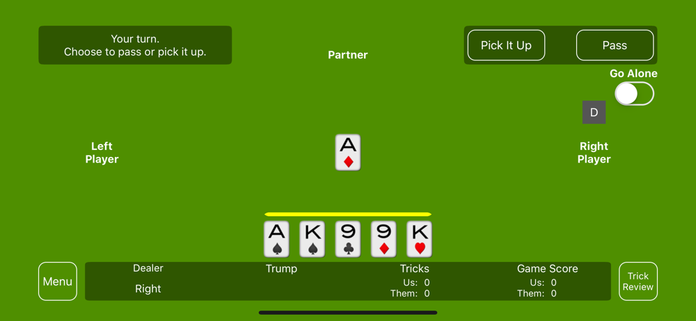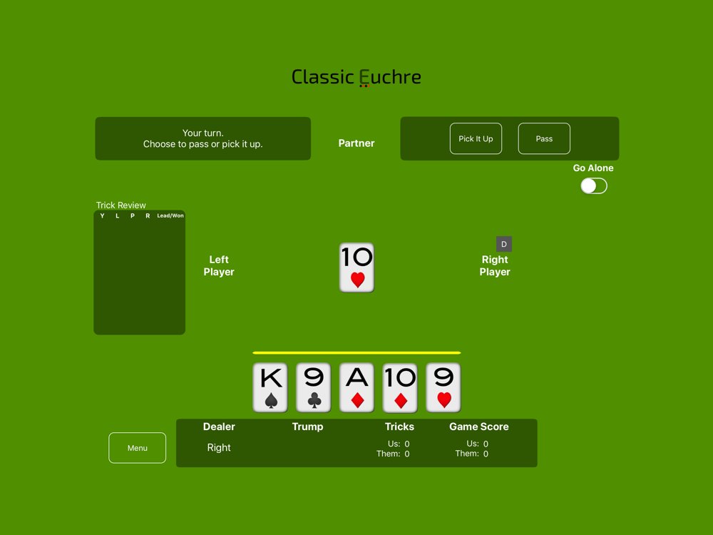 True to it’s origins, Classic Euchre brings a clean and simple interface along with straight forward play. You are paired up with a computerized opponent and play against a computerized team in the quest to reach 10 points first.