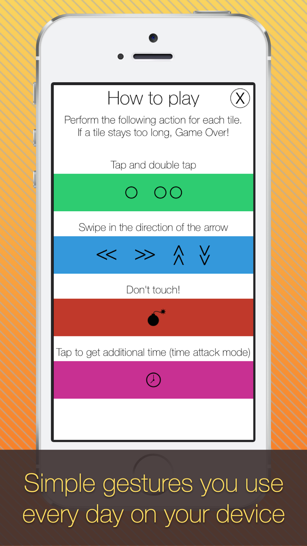 SwipeTap is a fast paced skill game that will keep you coming back for more. Can you beat your friends' scores? The gestures are easy and will be familiar to anyone who has used a touch screen device before . But can you keep up? A few seconds after the tile has come into play, it will flash and if it's not solved in time, it's game over!