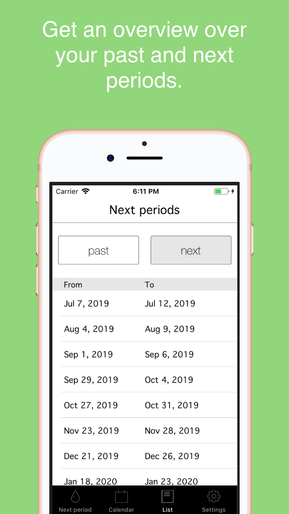 Quickly and easily record your last period and forecast your next period and fertile days. The app comes with a useful reminder function which informs you shortly before your next period starts. It intentionally avoids superfluous functions and concentrates on the core task: to record and forecast your period in an intuitive and beautiful way.
