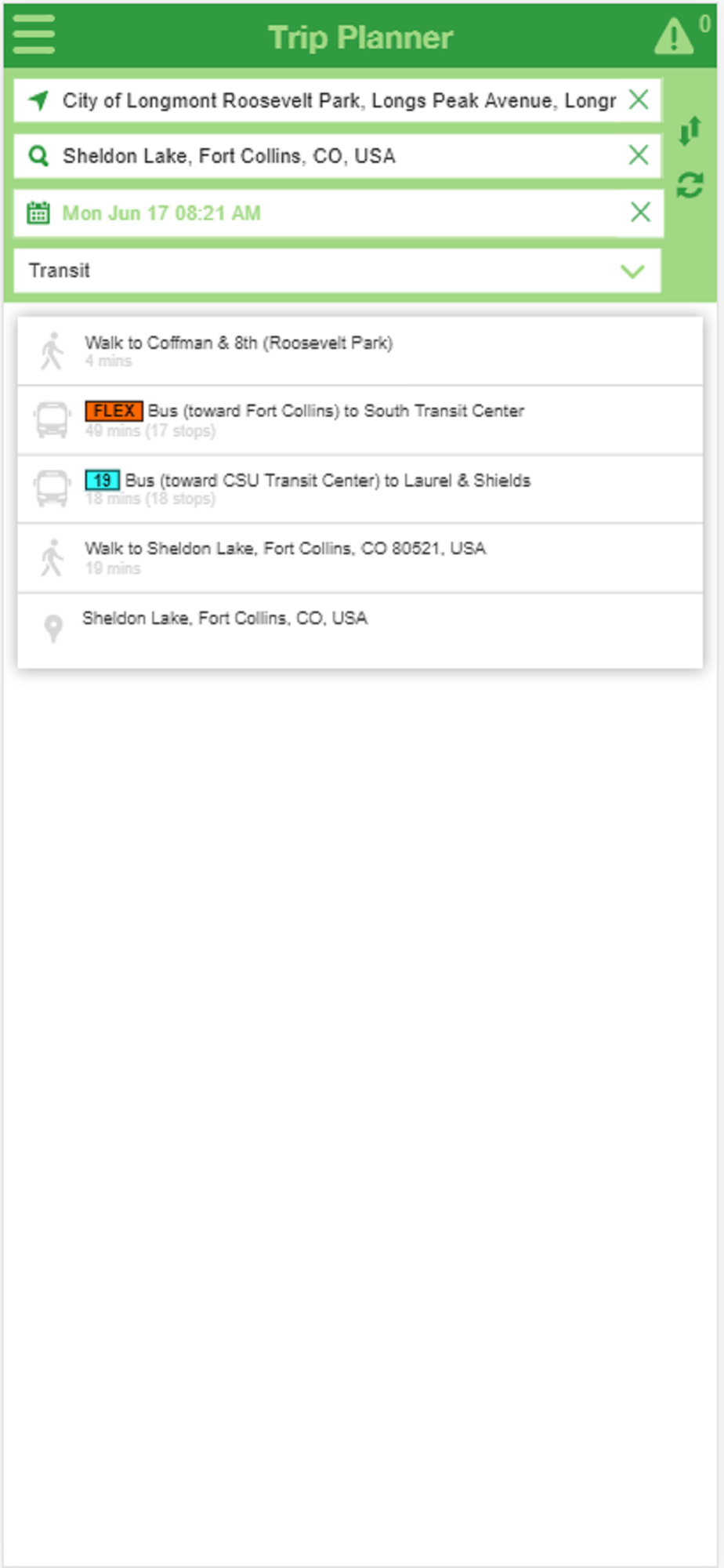 Ride Transfort, your guide to public transportation in Fort Collins, Colorado. Plan a trip, find a bus route, track your bus, and get real time bus arrival information on your iPad, iPhone or iPod Touch. The application uses data provided by Transfort and its bus tracking system over your device's WiFi or cellular network connection. Transfort riders have real time bus information at their fingertips for the first time. Enter your starting location and destination to access fast trip planning - instead of driving directions, we'll help you get around Fort Collins by bus. Save your favorite bus stop on the App for quick bus arrival information. Receive rider alerts and detours on your device, before you head out the door. Click on the Transfort system map, select a route, and see where your bus is in real time. Traveling by bus in Fort Collins has never been this easy!