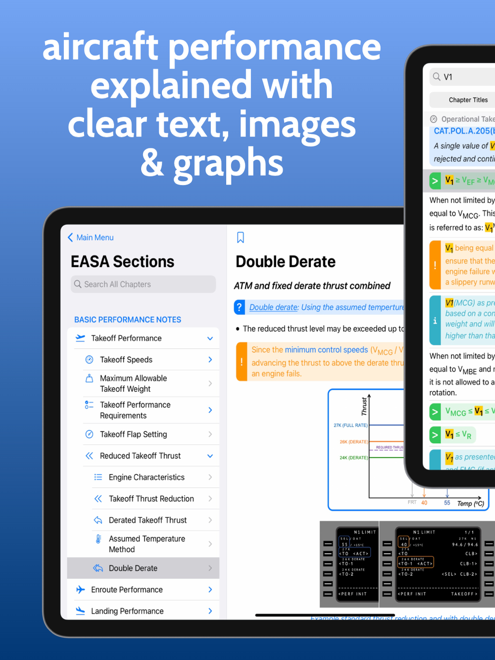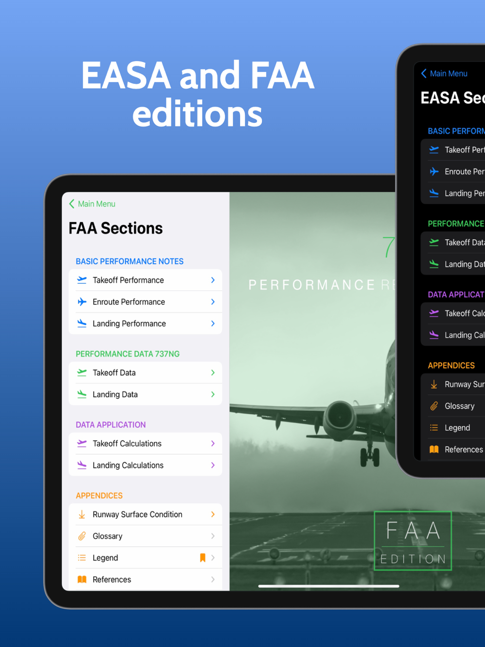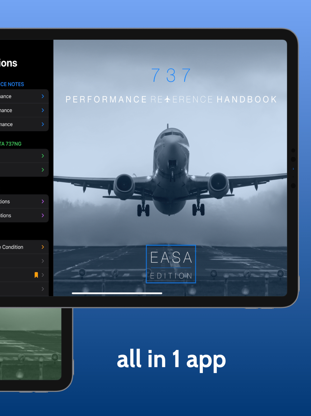 This app explains (EASA/FAA) regulations (based on ICAO) in lots of colorful pictures and additional remarks and you can navigate through BASIC PERFORMANCE NOTES, divided into TAKEOFF (covering a.o. legal performance requirements, reduced takeoff thrust), ENROUTE (covering a.o. cruise altitude/speed, driftdown) and LANDING Performance chapters (covering a.o. dispatch/inflight requirements) and also through the various performance data provided by Boeing in the chapters under PERFORMANCE DATA.