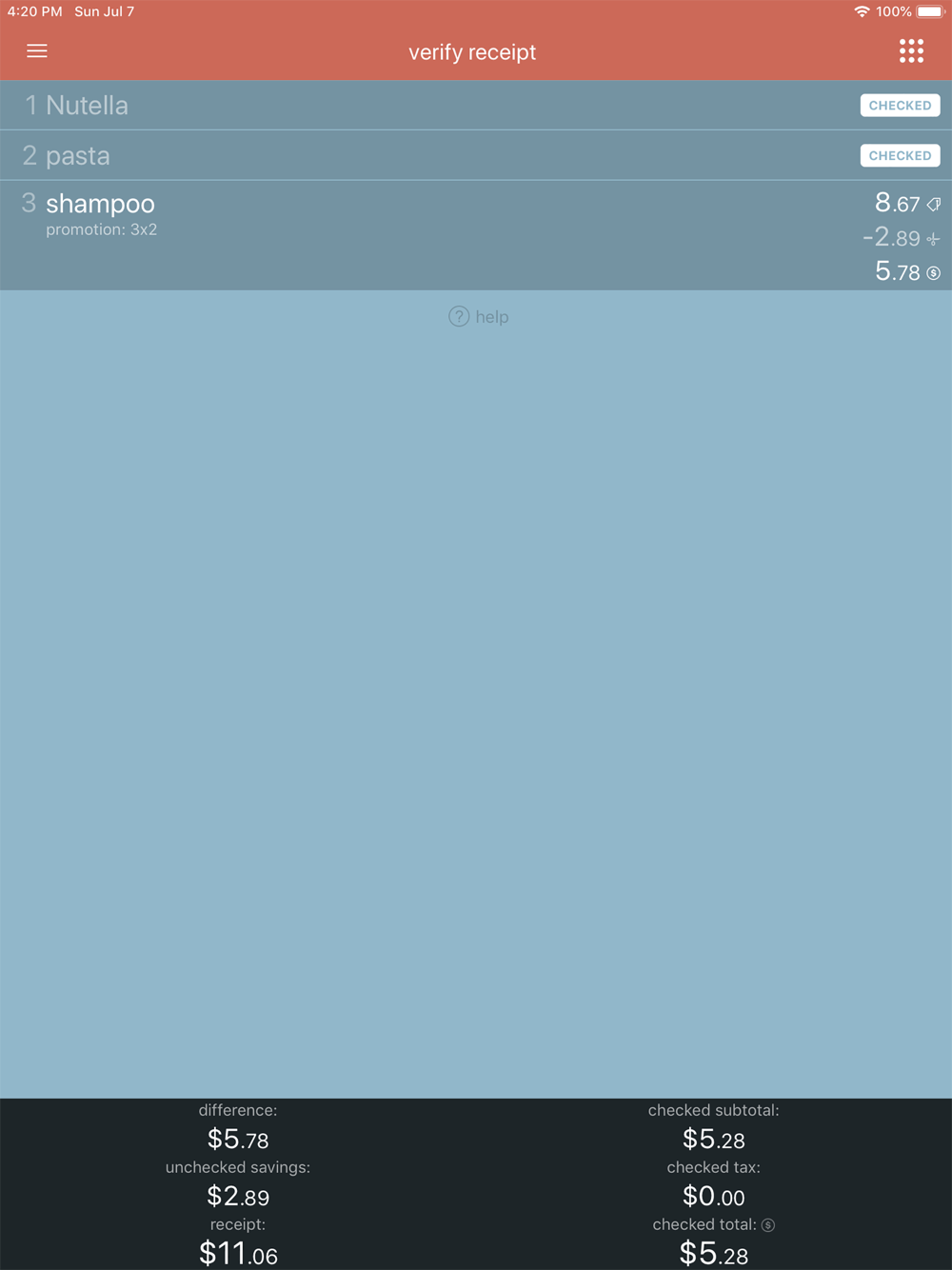 Tally has a specific section dedicated to the receipt verification. So you can, in seconds, find the inconsistency and show it to the cashier in order to be immediately reimbursed (or enjoy in case the error occurred is to your advantage).