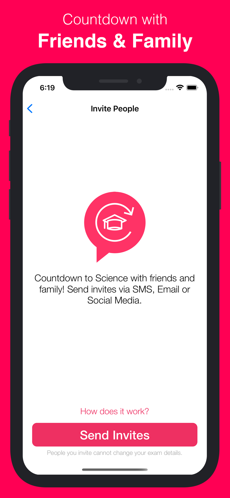 - Invite students, teachers, friends and family to countdown with you via Facebook, Twitter, Instagram, WhatsApp, SMS and Email.