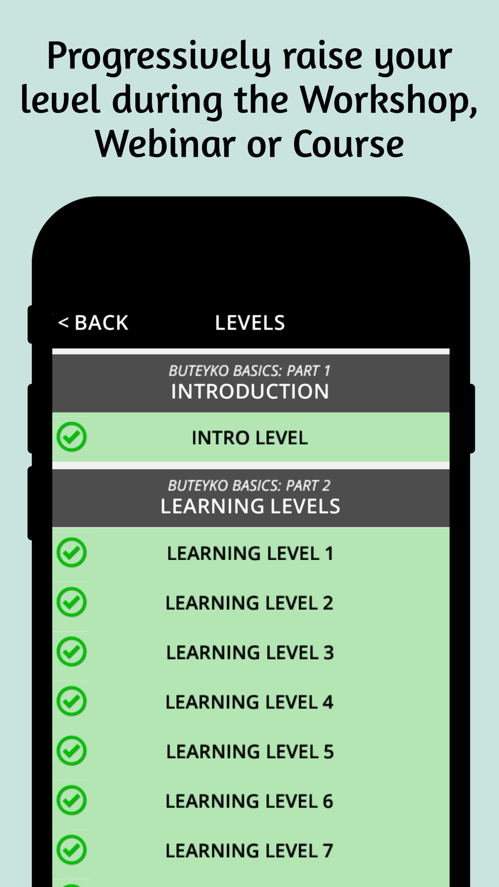 An activated user account is required to use all features of the app. Participants to the complete workshop, course or webinar receive a fully upgraded user account which opens up all features and levels of the app. More info at www.ButeykoBreathing.com.