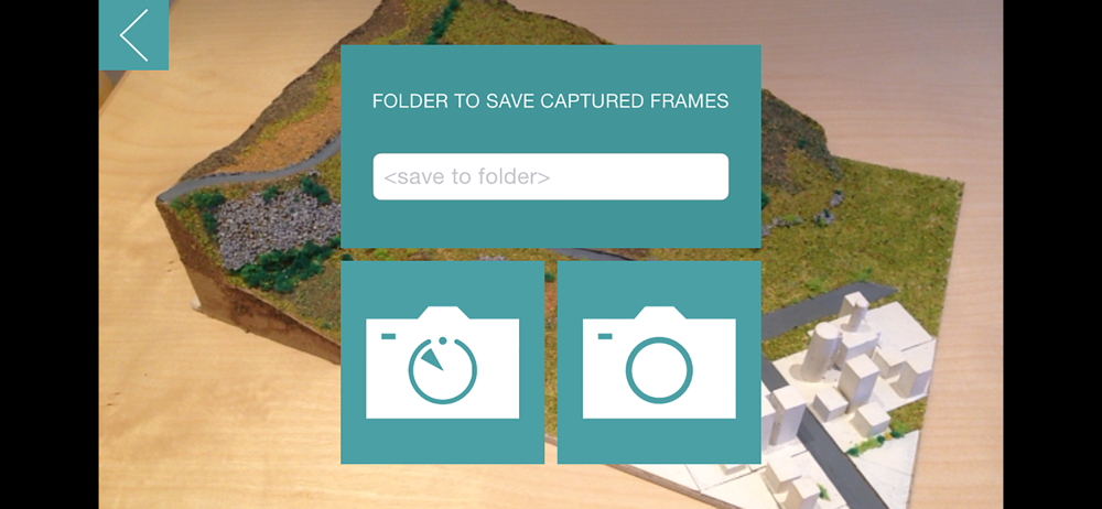 In "Capture" mode the user first of all chooses a folder to save photos in (this folder will be created in the iTunes File Sharing section related to the app) than he chooses if either shoot every single photo manually or automatically take a photo every N seconds (as set in the app's settings). Photos (frames) captured by the app are supposed to be uploaded to the ARMedia SDK developers' portal where they will be processed in order to generate a 3D map/pointcloud - the generated point cloud (and tracking configuration) must be downloaded and copied in the iTunes File Sharing section related to the app in order to be tested when the app is in "Tracking" mode).