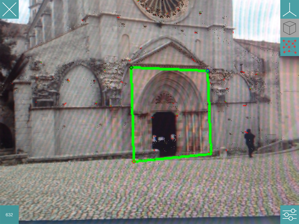 In "Tracking" mode, the app will load any tracking configuration eventually found in the iTunes File Sharing section related to the app and will start the tracking engine. During tracking, the user's environment is searched for the real object defined by the tracking configuration and, when it is found, some visual hints appear registered in 3D on the object itself. By means of a toolbar the user can choose to display reference axes, a custom model (as specified in the app's settings) and the 3D map/pointcloud being tested. Finally, the user can tune tracking parameters by means of visual sliders and save a custom tracking configuration (stored in the same folder of the original tracking configuration files) that he can later deploy with his own app developed with the ARMedia SDK.