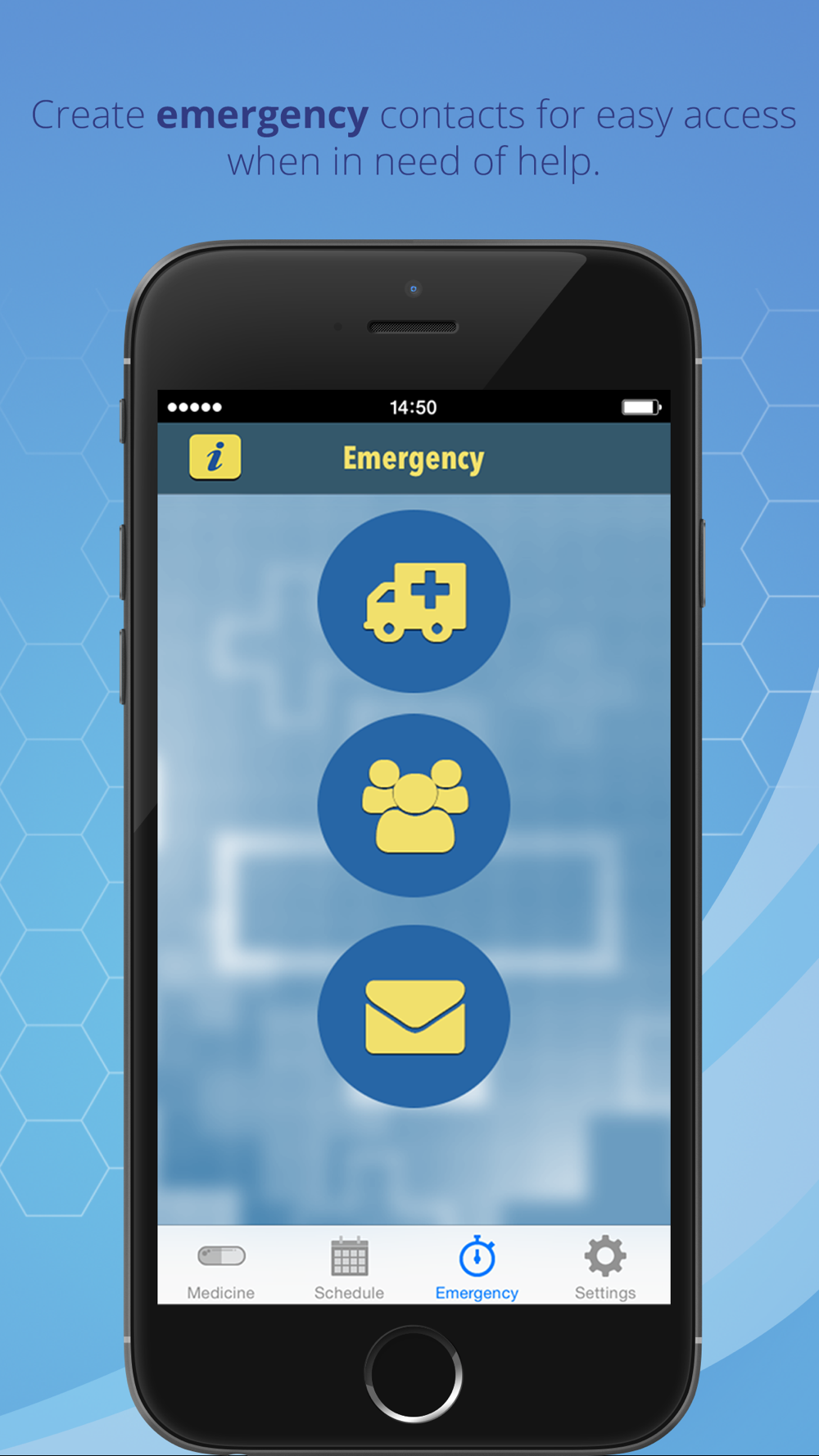 • Call emergency contacts and medical services directly from the app using pre-programmed numbers such as family, friends, doctors, chemists or advisors.