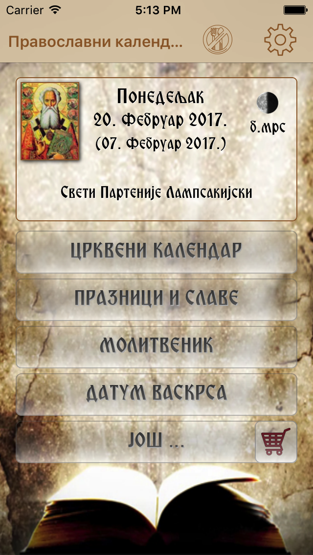 - Crkveni kalendar, u periodu od 2012. do tekuće godine. sa dnevnim prikazom datuma po gregorijanskom i julijanskom kalendaru, mesečeve mene i vrste posta. Crkveni kalendar automatski prilagođava pokretne praznike i postove za svaku godinu prema Vaskrsu kao i mesečeve mene.