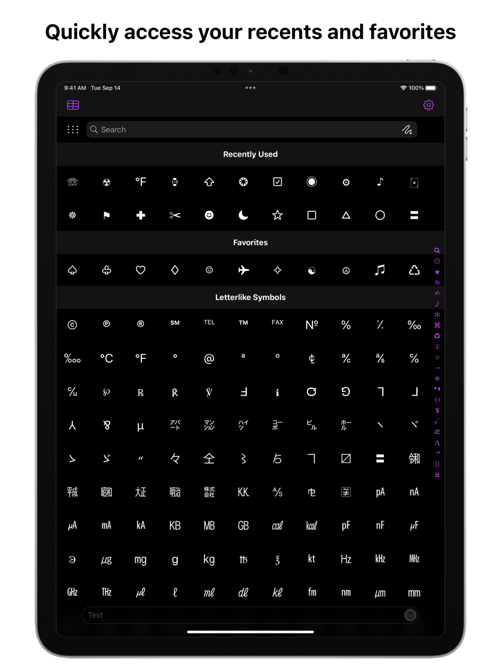 UniChar features thousands of symbols organized neatly into categories as well as a complete Unicode table.* You can quickly search for the symbol you’re looking for by name or by drawing, type symbols in any app with the custom keyboard, and collect your favorite symbols to access them even quicker.