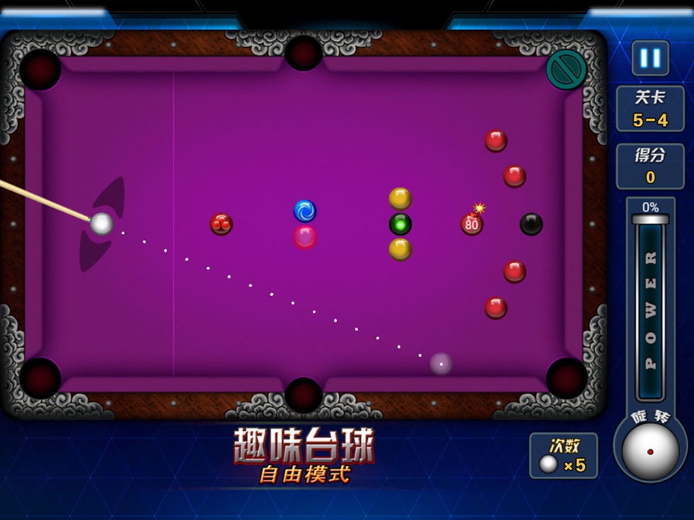 5大场景,120个精选关卡。普通台球,特殊威力台球,体验成为台球大师的无尽乐趣!