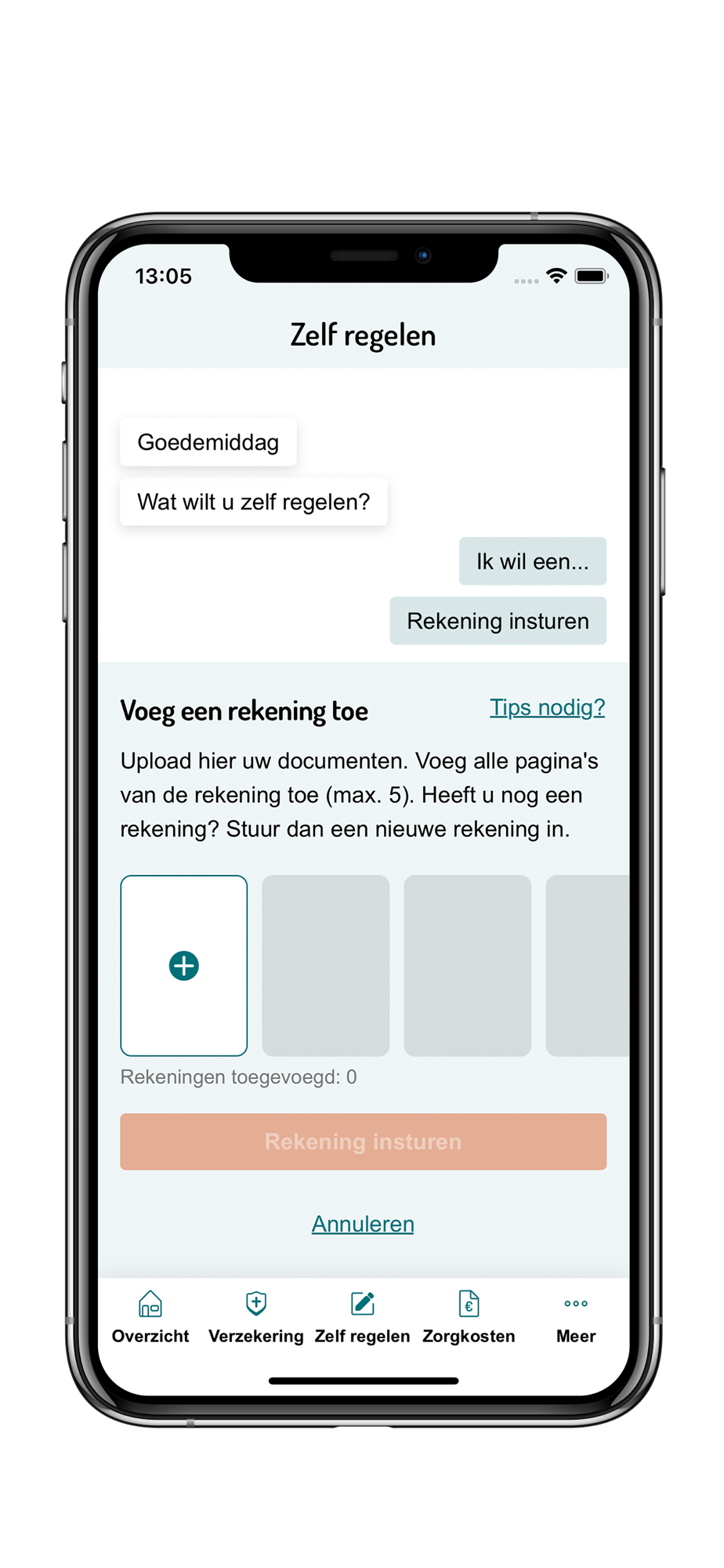 Maak in de app een foto van de rekening upload deze direct. Heeft u de rekening digitaal ontvangen? Upload dan de PDF en stuur de rekening veilig en snel in. Binnen 3 werkdagen staat het geld op uw rekening.