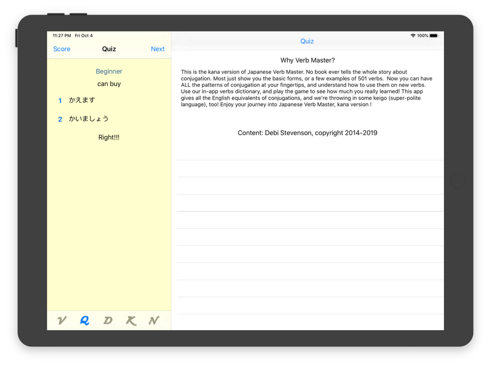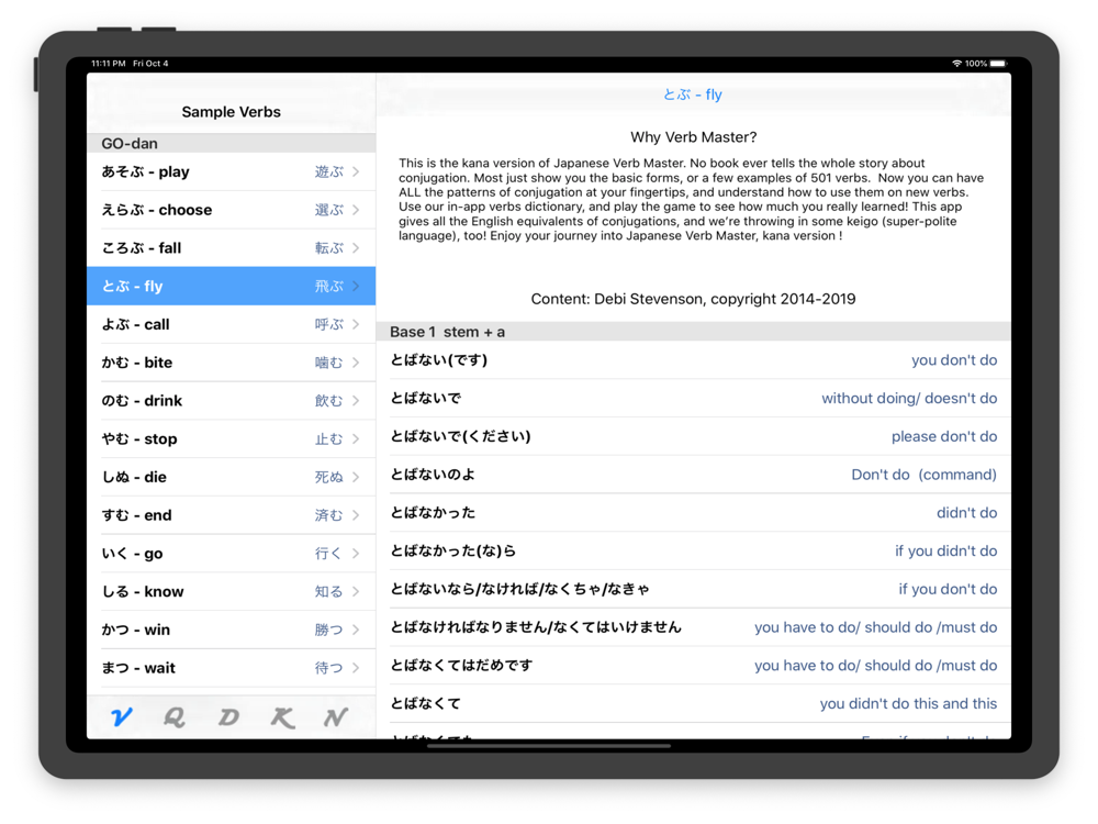 No book ever tells the whole story about conjugation. Most just show you the basic forms, or a few examples of 501 verbs. Now you can have ALL the patterns of conjugation at your fingertips, and understand how to use them on new verbs. Use our in-app verbs dictionary, and play the game to see how much you really learned! This app gives all the English equivalents of conjugations, and we’re throwing in some keigo (super-polite language), too! Enjoy your journey into Japanese Verb Master,kana version !