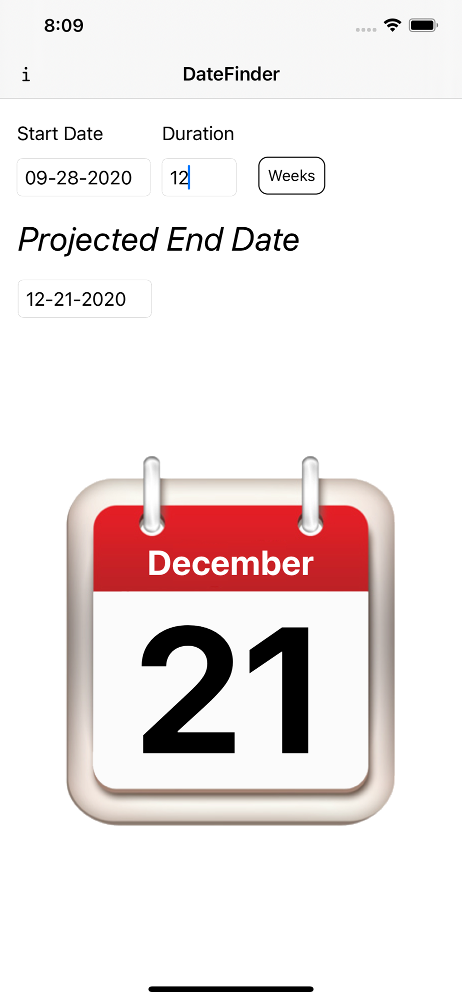 DateFinder is a simple App that allows the user to enter a starting date and then find the end date based upon a specific number of weeks or days.