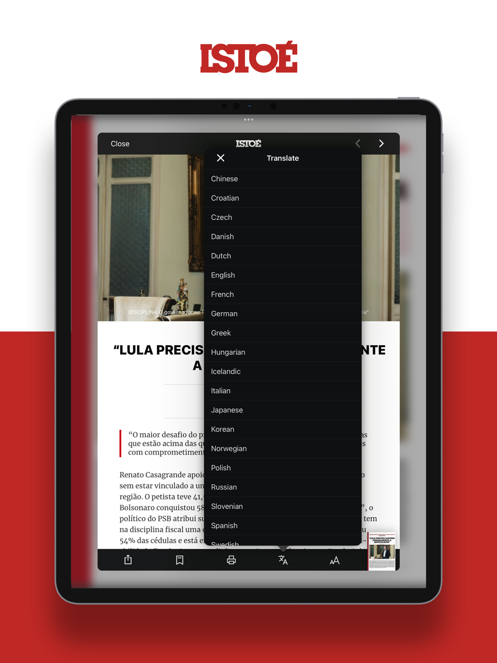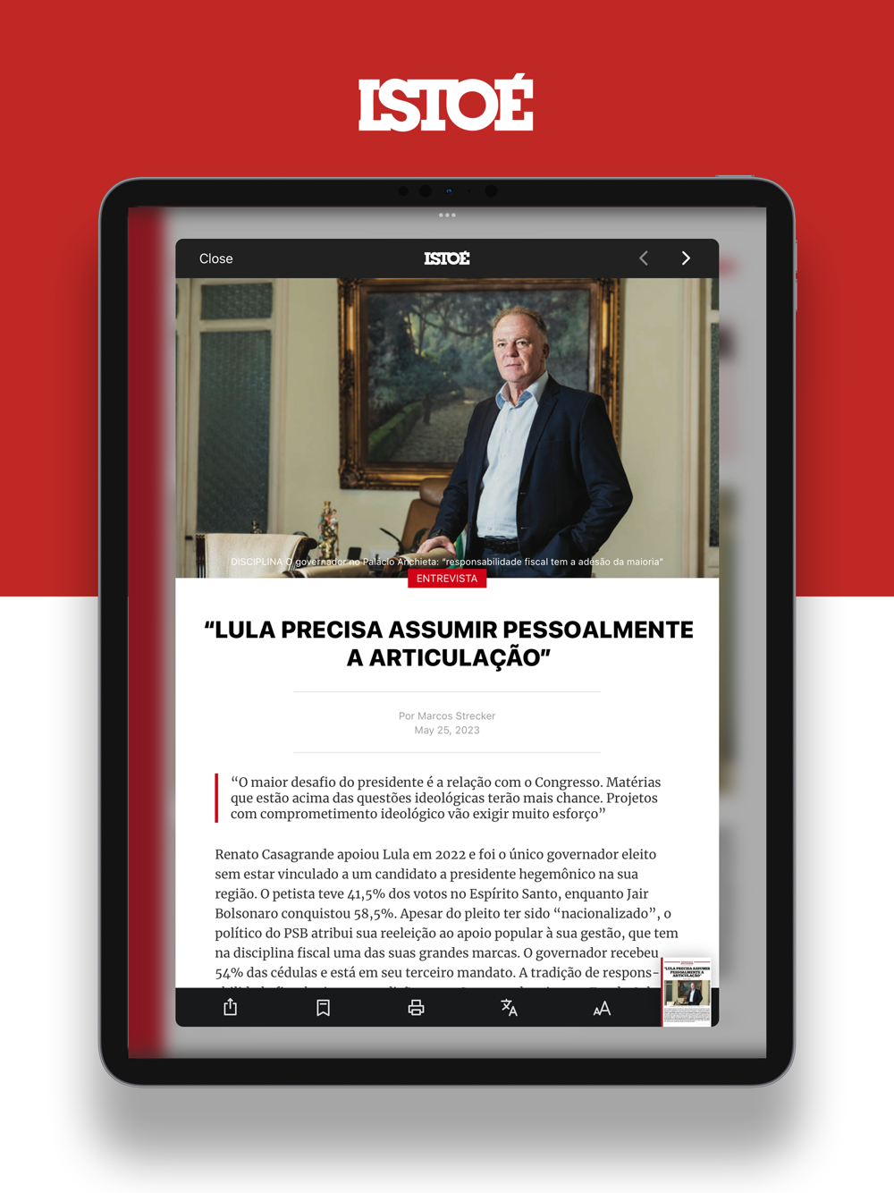 No aplicativo, você vai encontrar a edição completa da revista, com as seções, as entrevistas e as reportagens que transformaram a ISTOÉ em referência no jornalismo brasileiro, com toda a interatividade permitida pelo seu iPad, vídeos e conteúdo exclusivo.