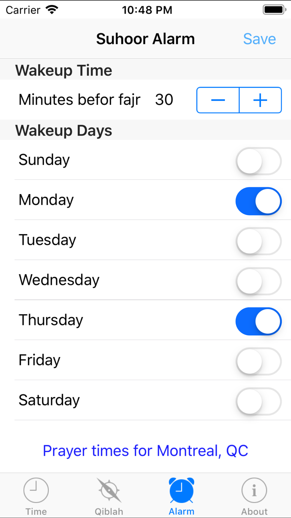 Wither fasting specific days of the week or fasting the whole month of Ramadan, Suhoor Alarm is a smart tool that keeps watching the changes in Fajr time and will wake you up at any desired minutes before Fajr.