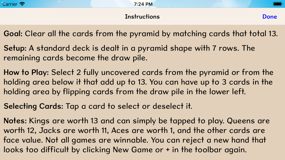 Pyramid is a solitaire card game favorite -- and this version is even more fun with an optional Aztec pyramid motif. Tap 2 cards that add up to 13; or drag one card onto another to make 13. Choose number of rows, background, card face, and submit your best scores to Game Center.