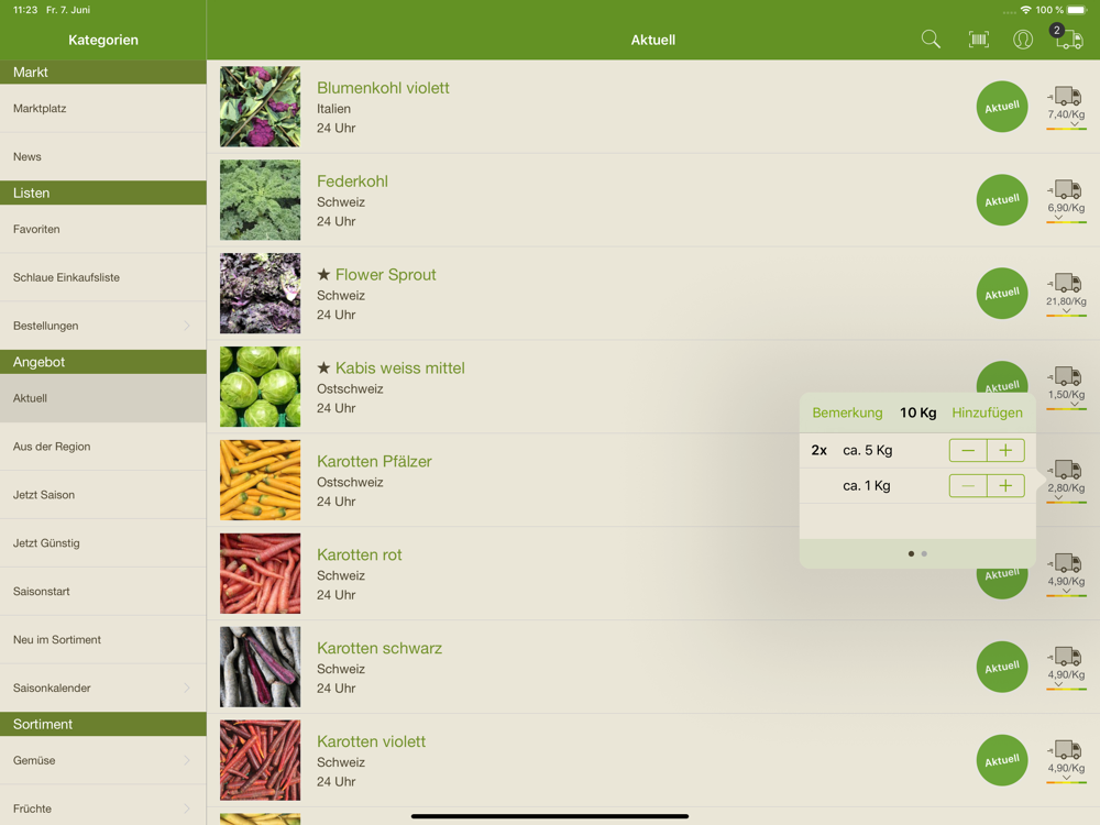 - Filtern Sie die Produkte nach Preisniveau, Saison und Herkunft
