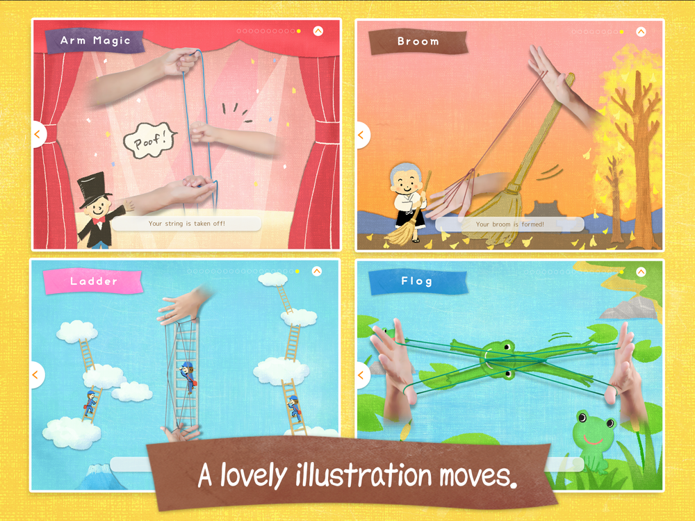 Enjoy Cat's Cradle is a series of string figures that is various patterns and shape played by your fingers and hands. Since this application use pictures to imagine the various scenes, especially children feel fun to play. Changing the common strings has the potential to enhance children's imagination and curiosity.