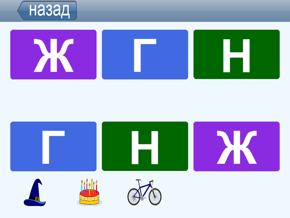 * Звуково разпознаване – Детето кликва на буквата от дадените възможности. Кликни на символът, чието име е зададено.