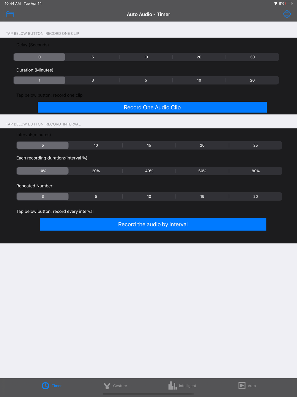 8 Repeat recording. Some times, you may need to record the sound files after the indicted duration. In the timer tab page, tap the button - record the audio by interval.