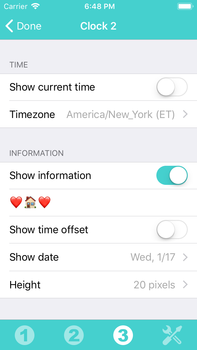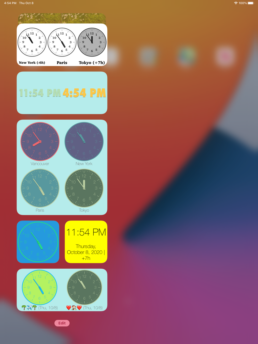 Each Clock widget allows to view 1 to 6 different clocks on the same row.