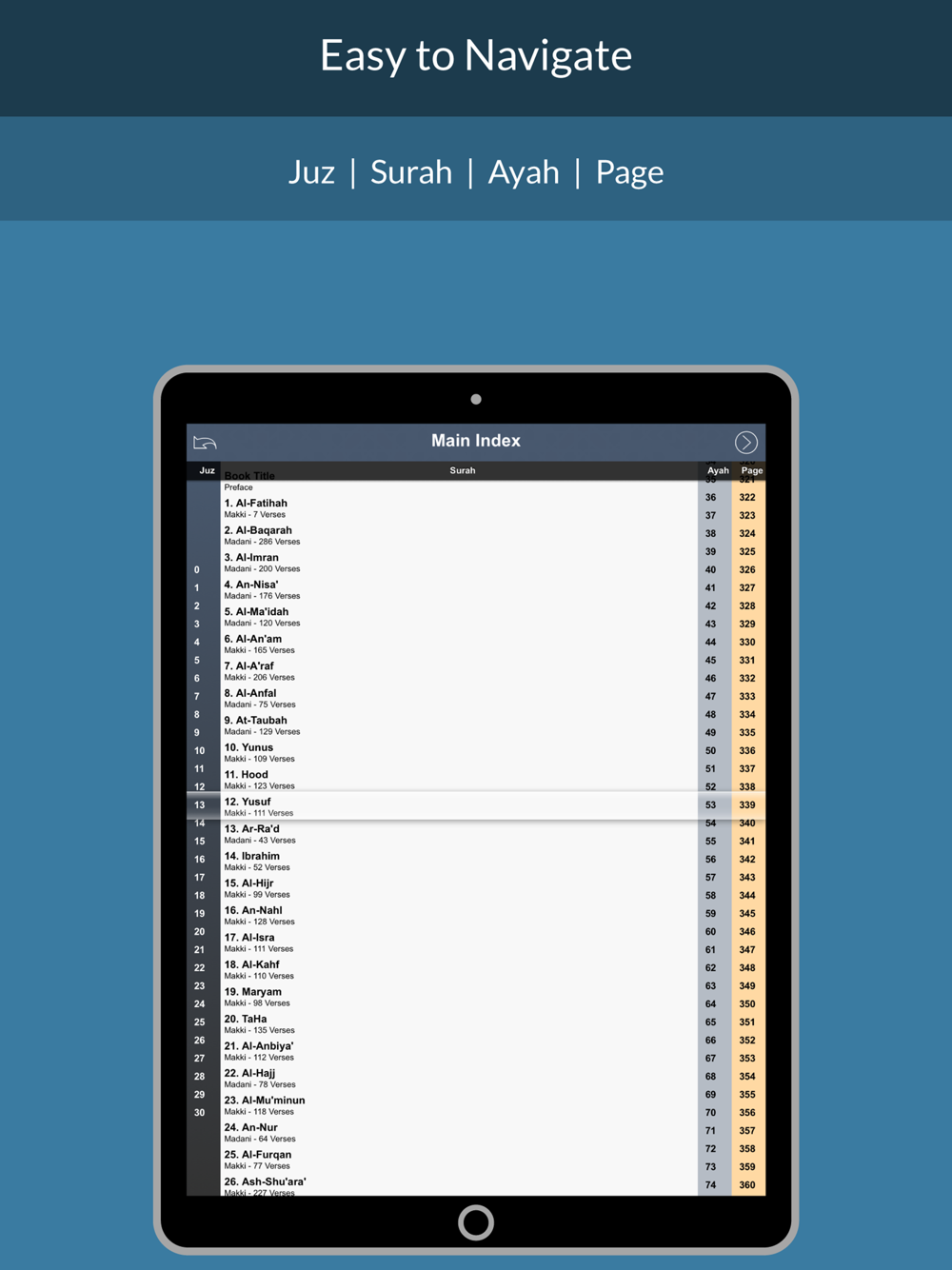 - Classic 13 Line Quran script in book style reading experience, with an easy to use interface