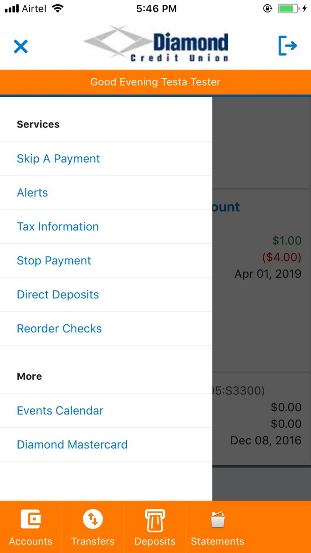 With Diamond Credit Union's updated mobile app, you can view account balances, transaction history, transfer funds, pay bills, find branches, and deposit checks remotely.